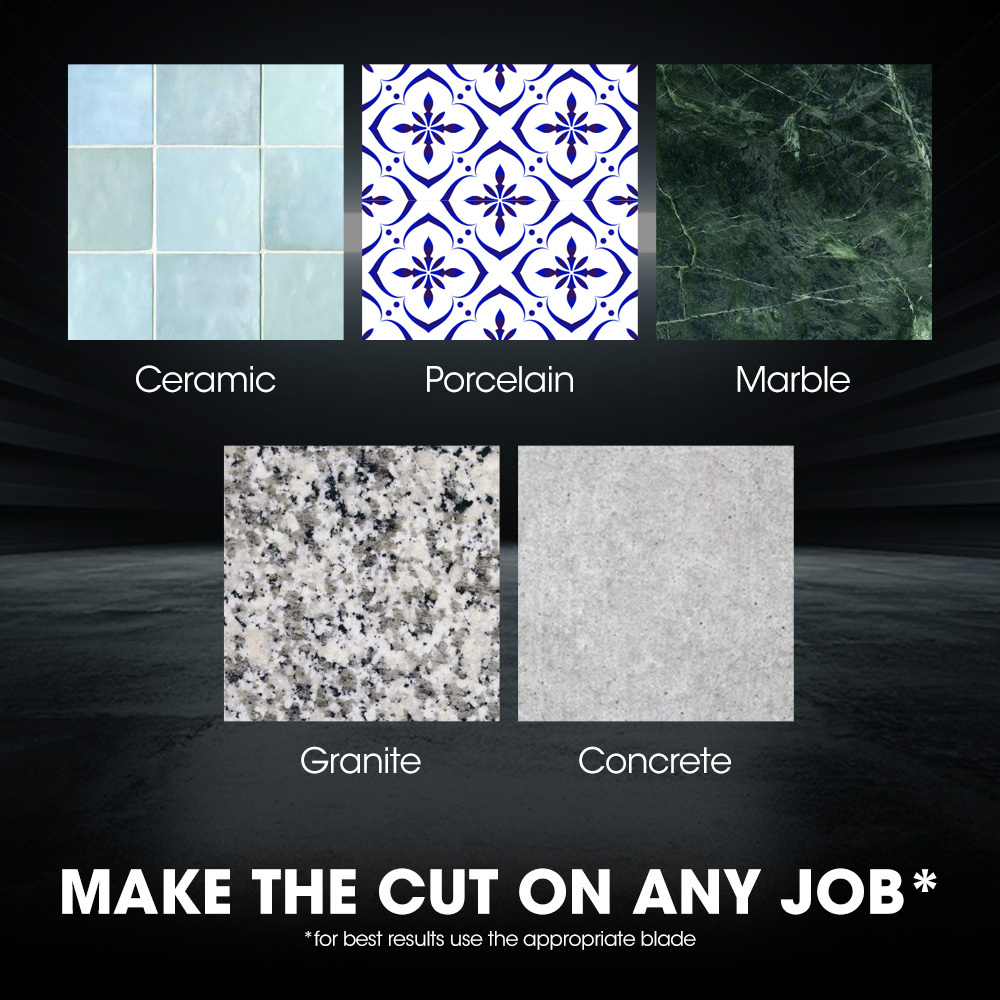 You can adjust the table tilt in seconds in order to add bevelled edges to tiles up to 30mm deep. There is also an onboard mitre square enabling you to easily repeat perfect diagonal cuts. The high-performance Diamond Blade is ideal for most ceramic and porcelain tiles. A high-performance aftermarket blade will provide optimal cutting results and enable working with dense materials like marble and granite.