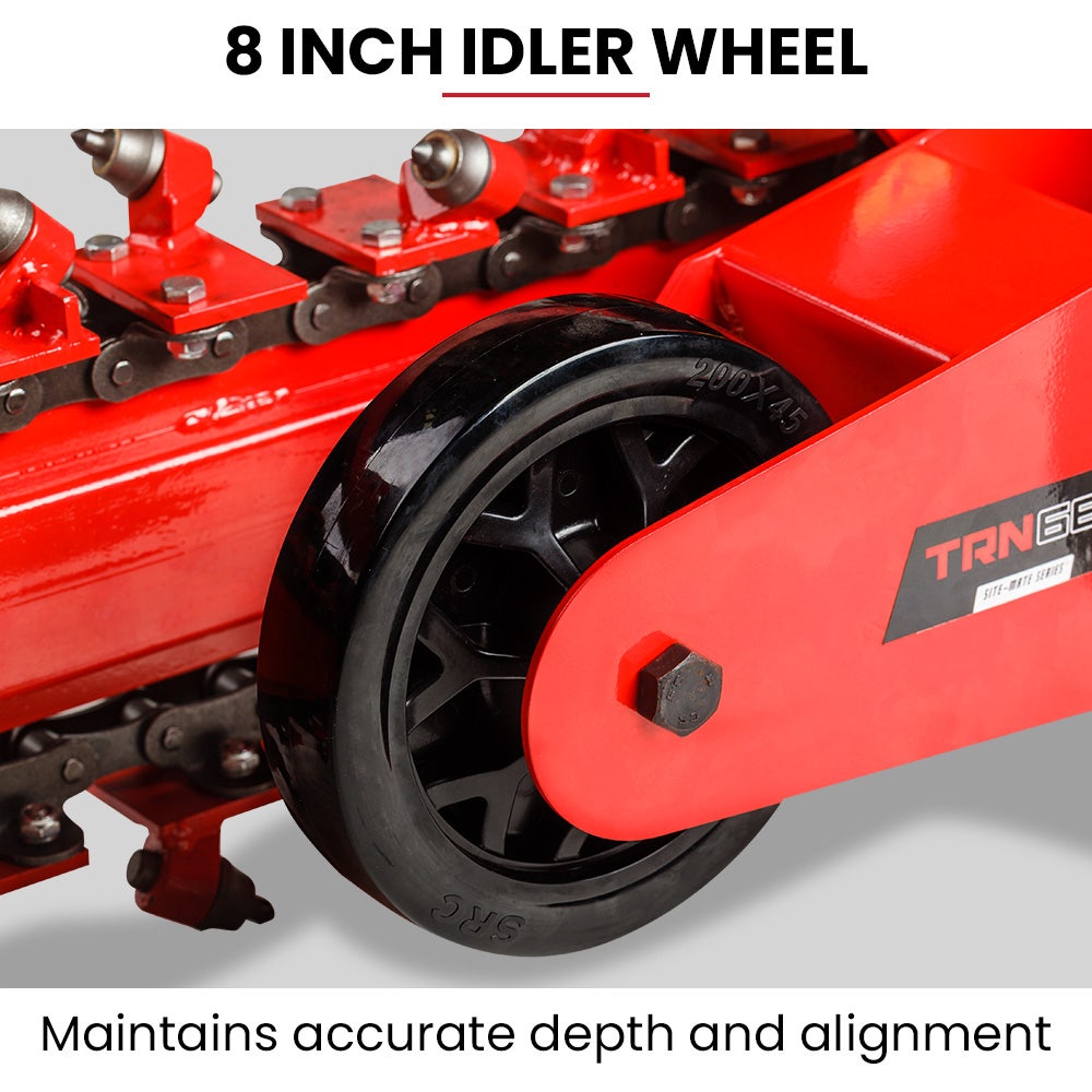 The TRN660 features 27 replaceable tungsten carbide teeth that dig up to 600mm deep and 100mm wide. This significantly reduces the time and effort compared to manual digging. Its compact design, just under 1m wide, allows easy access through gates and close-to-wall trenching.