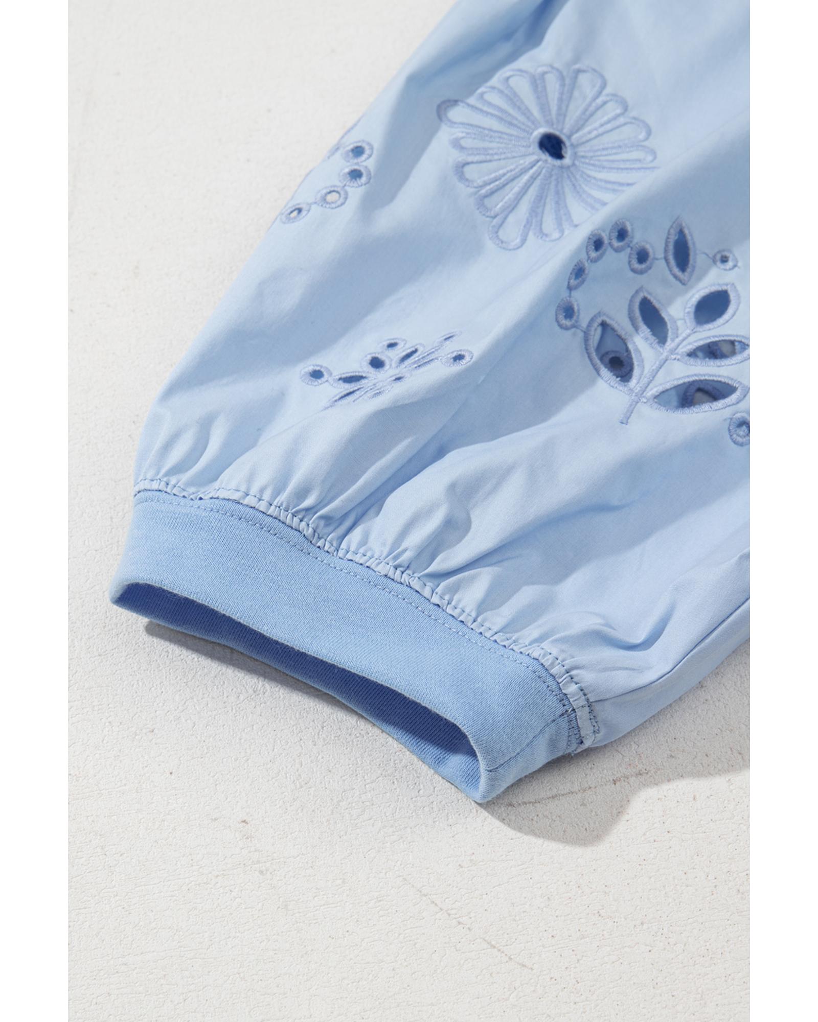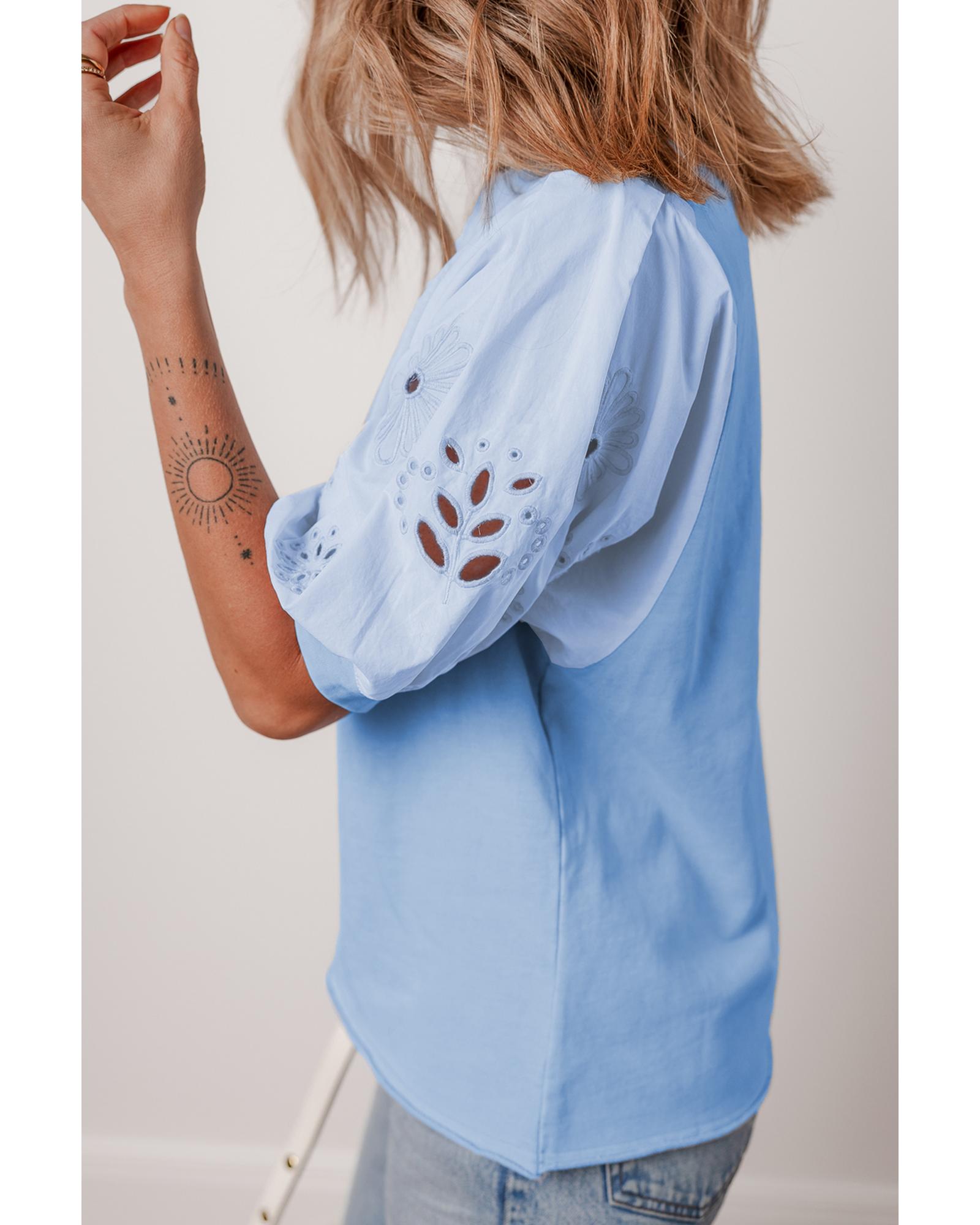 Beau Blue Eyelet Flower Embroidered Puff Short Sleeve Patchwork Crew Neck Blouse – L