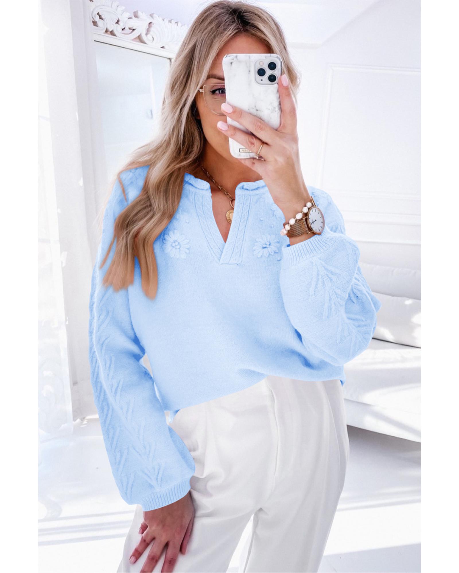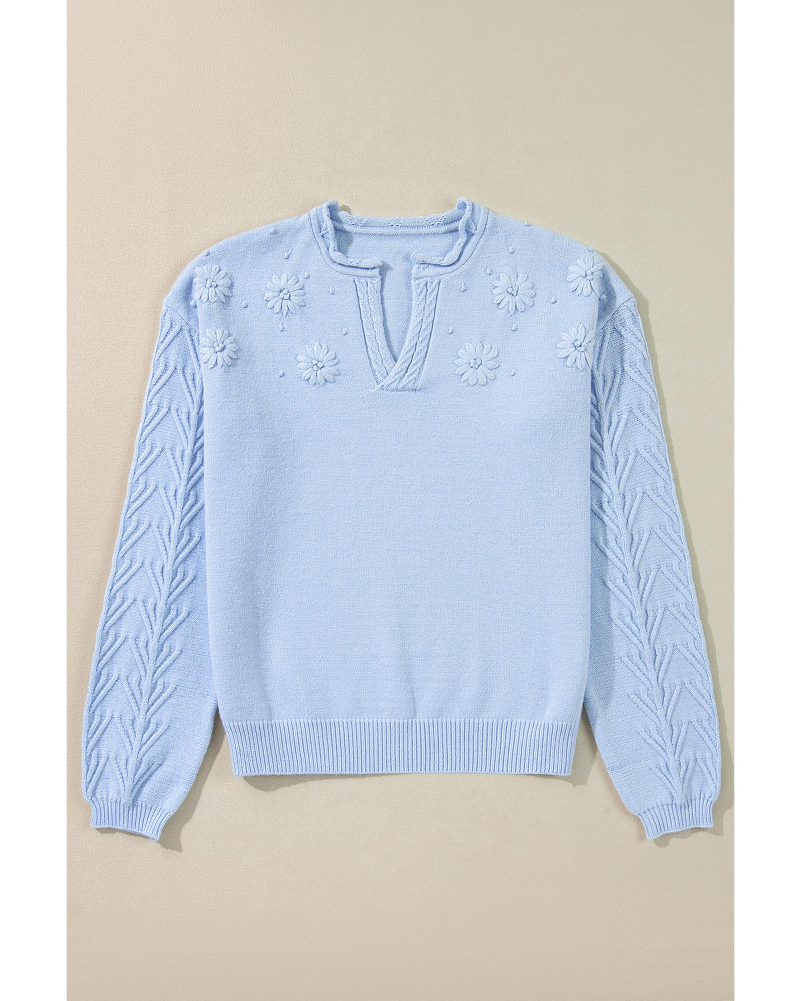 Beau Blue Flower Detail Knitted Notched Neck Sweater – M