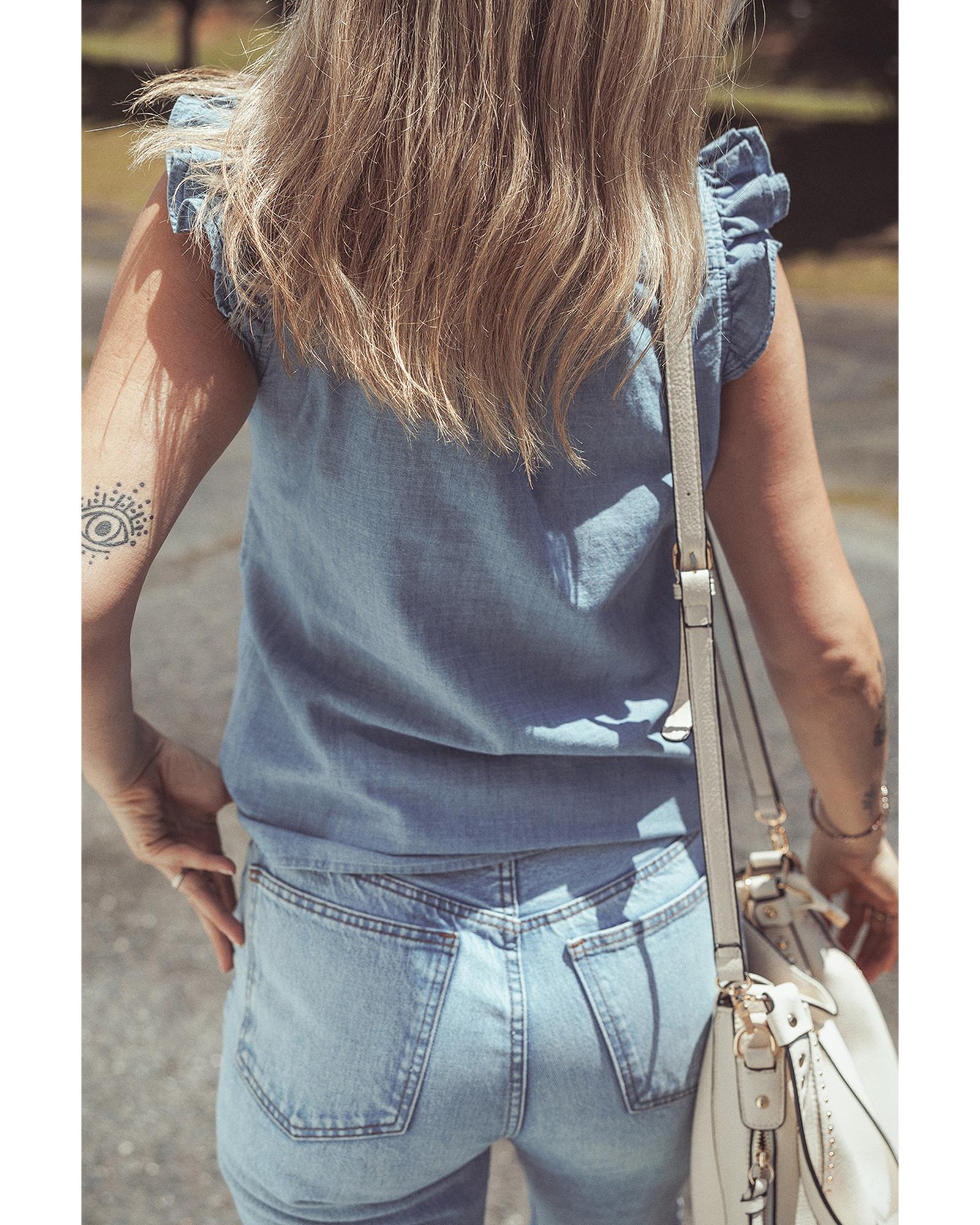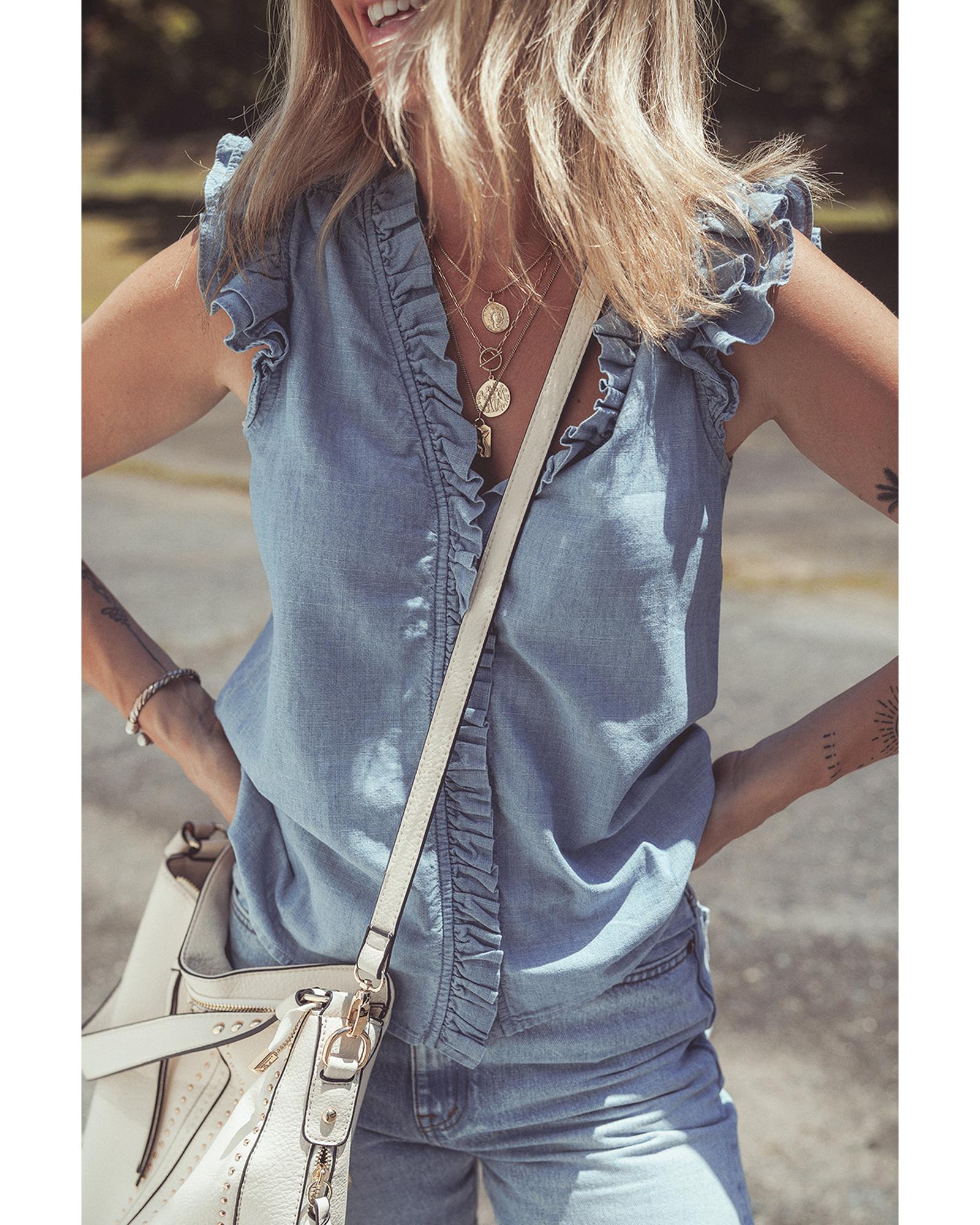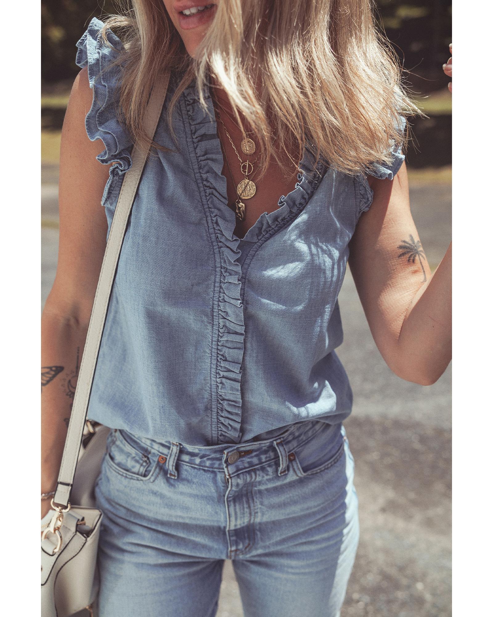 Beau Blue Frilly Ruffle Trim V Neck Chambray Tank Top – L