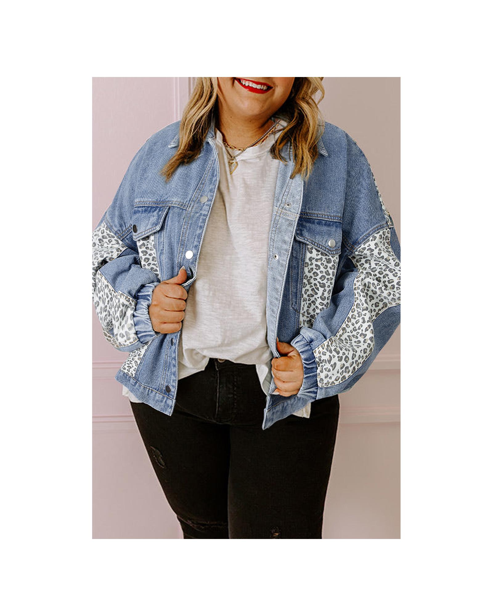 Beau Blue Leopard Patchwork Flap Detail Plus Size Denim Jacket – 3X