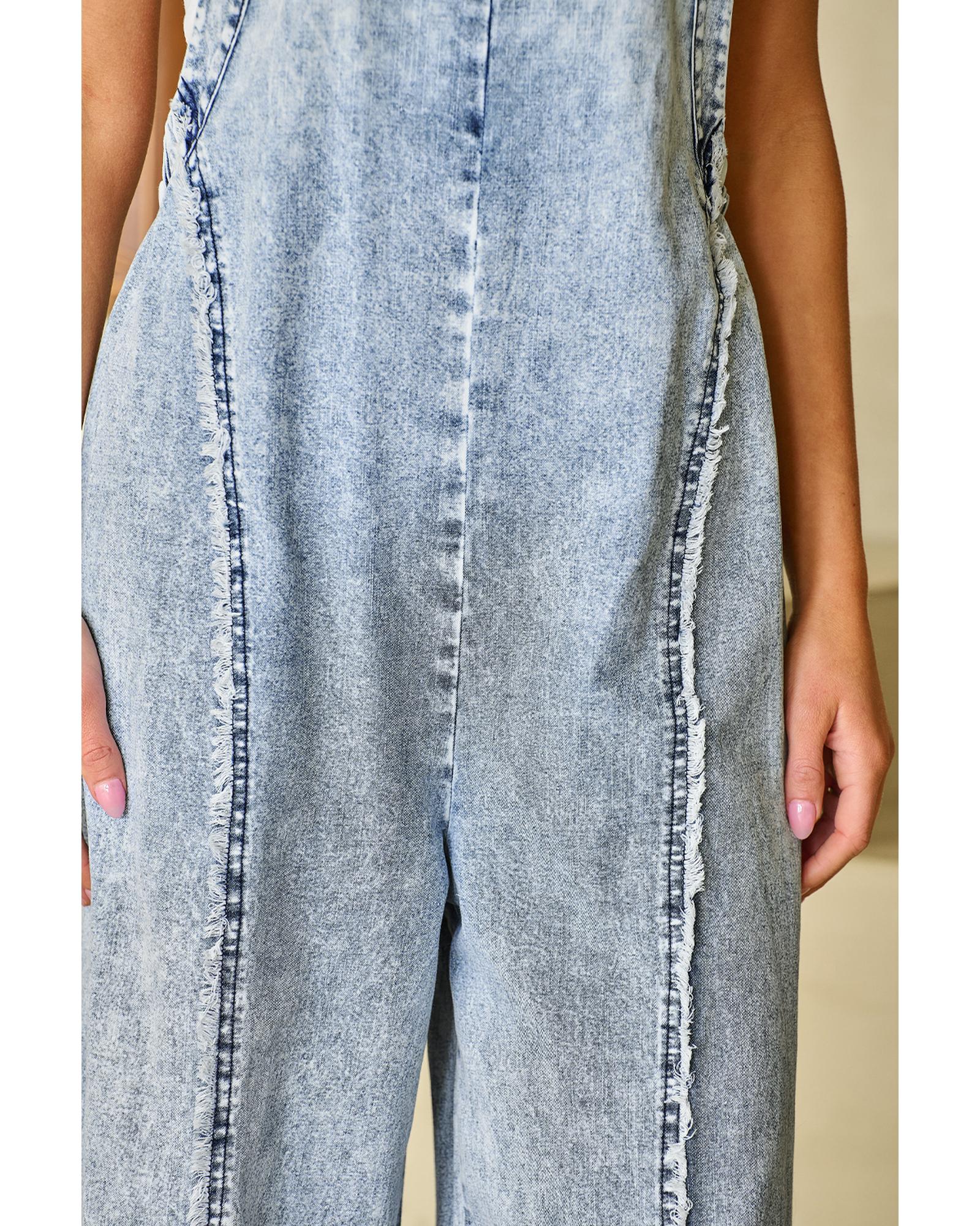 Beau Blue Light Wash Frayed Exposed Seam Wide Leg Denim Overall – L