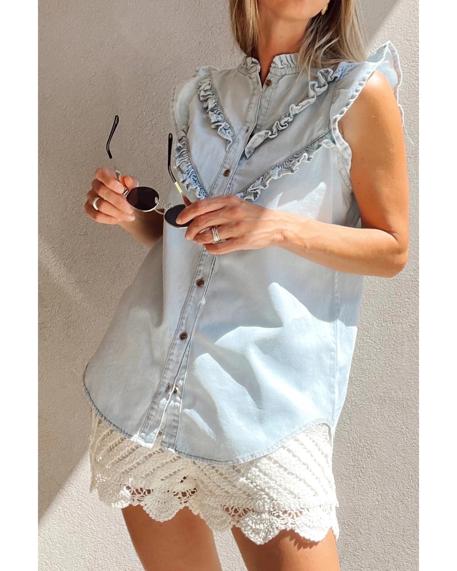 Beau Blue Mineral Wash Cap Sleeve Frilled Button Up Denim Shirt – S