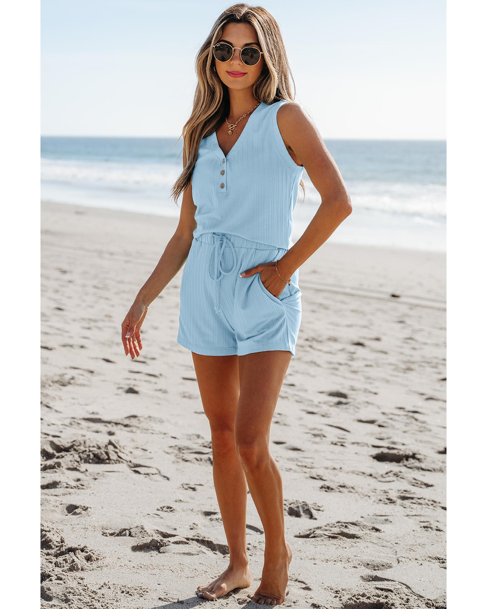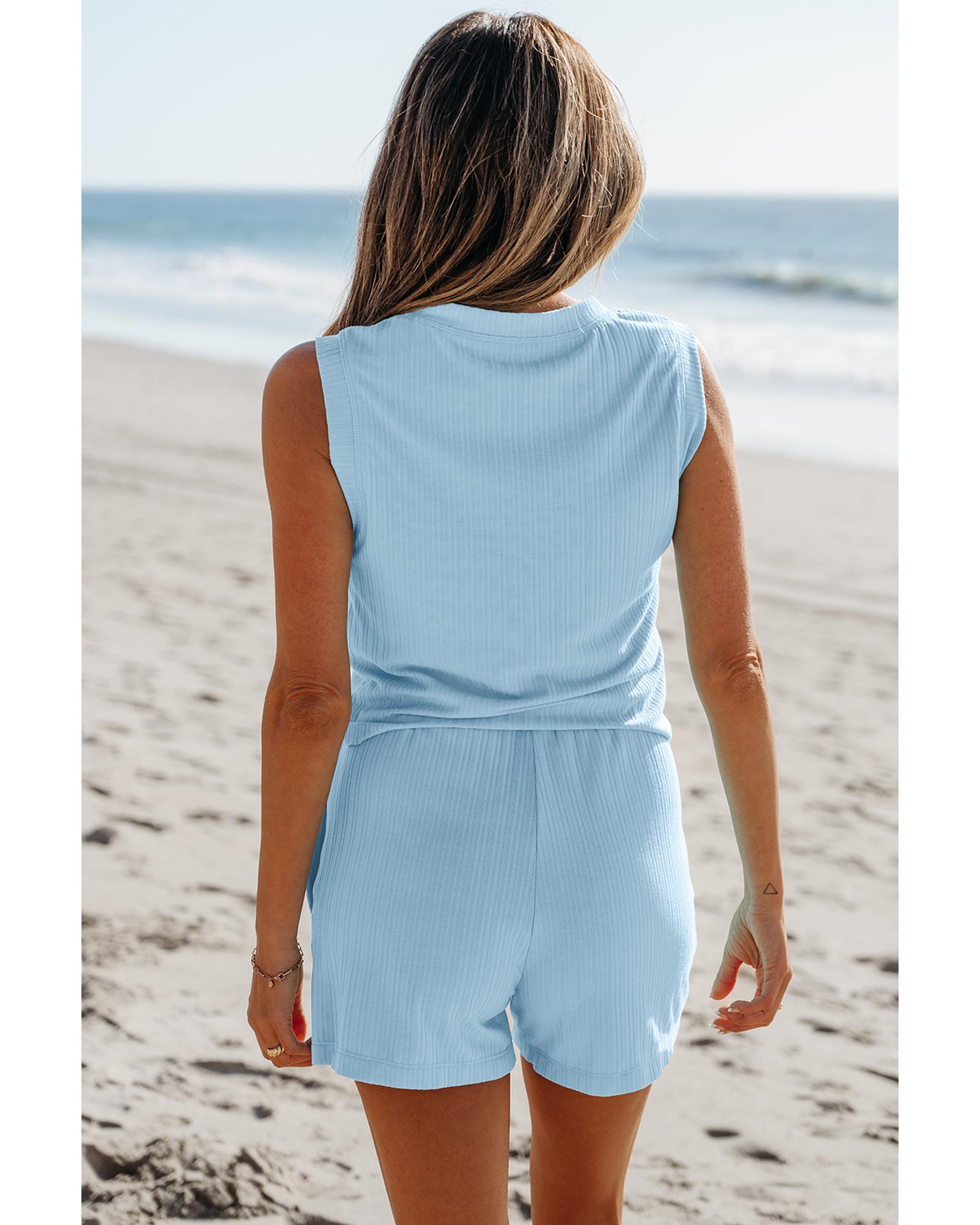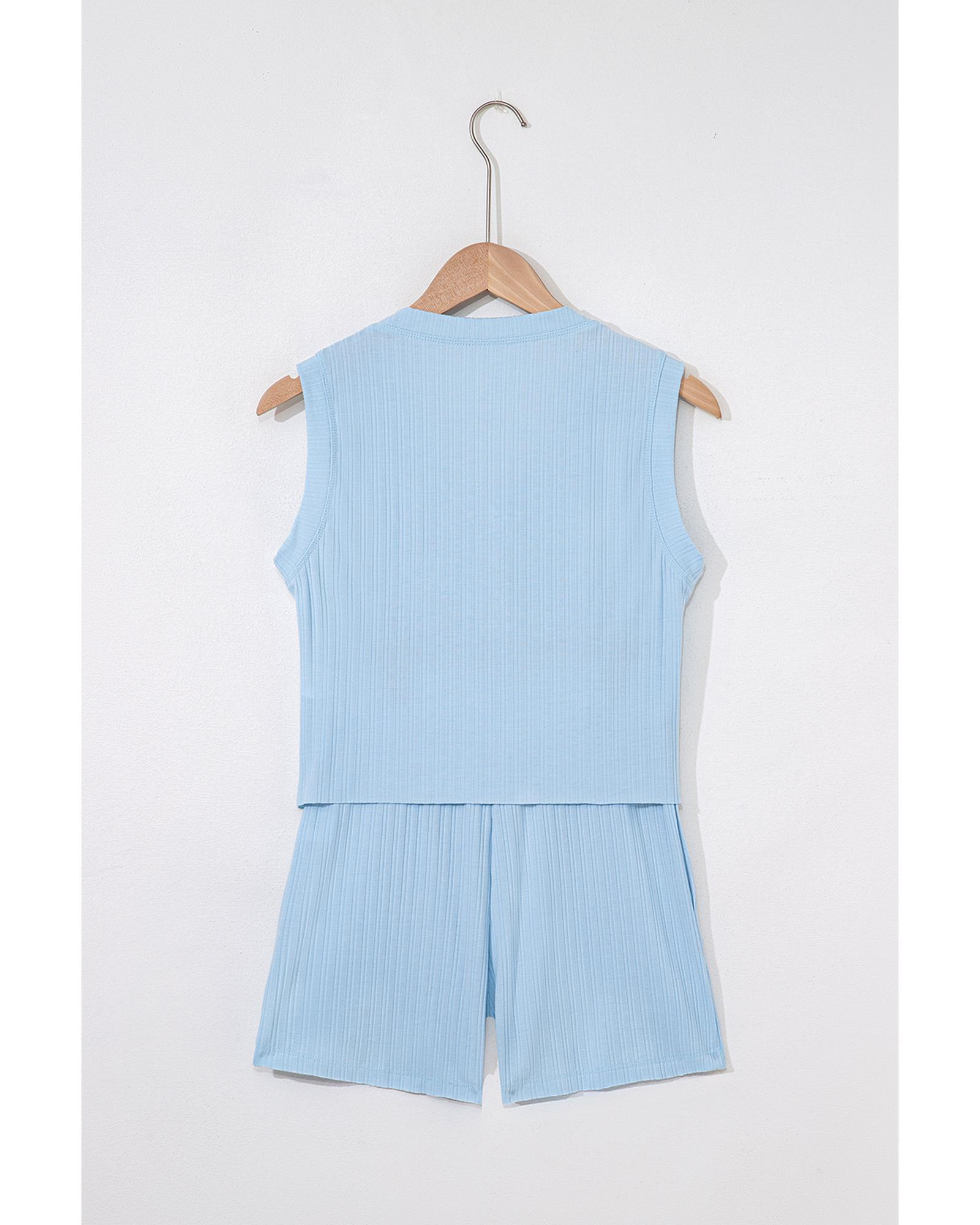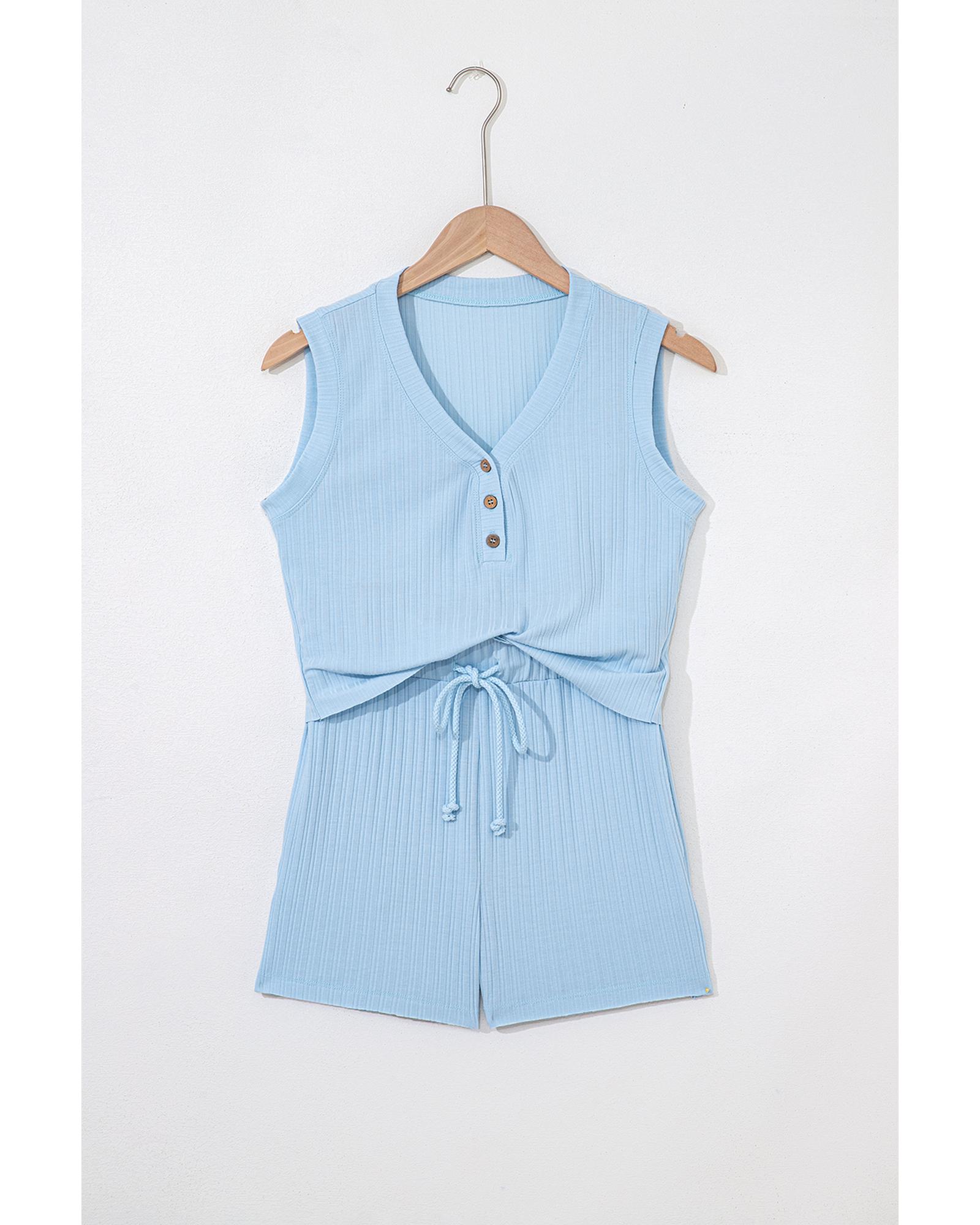 Beau Blue Ribbed Button V Neck Tank Top and Shorts Set – M
