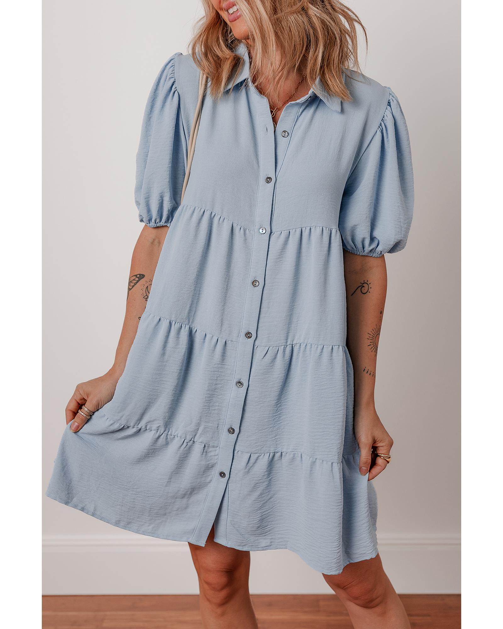 Beau Blue Shirt Collar Button Up Short Puff Sleeve Tiered Shift Dress – M