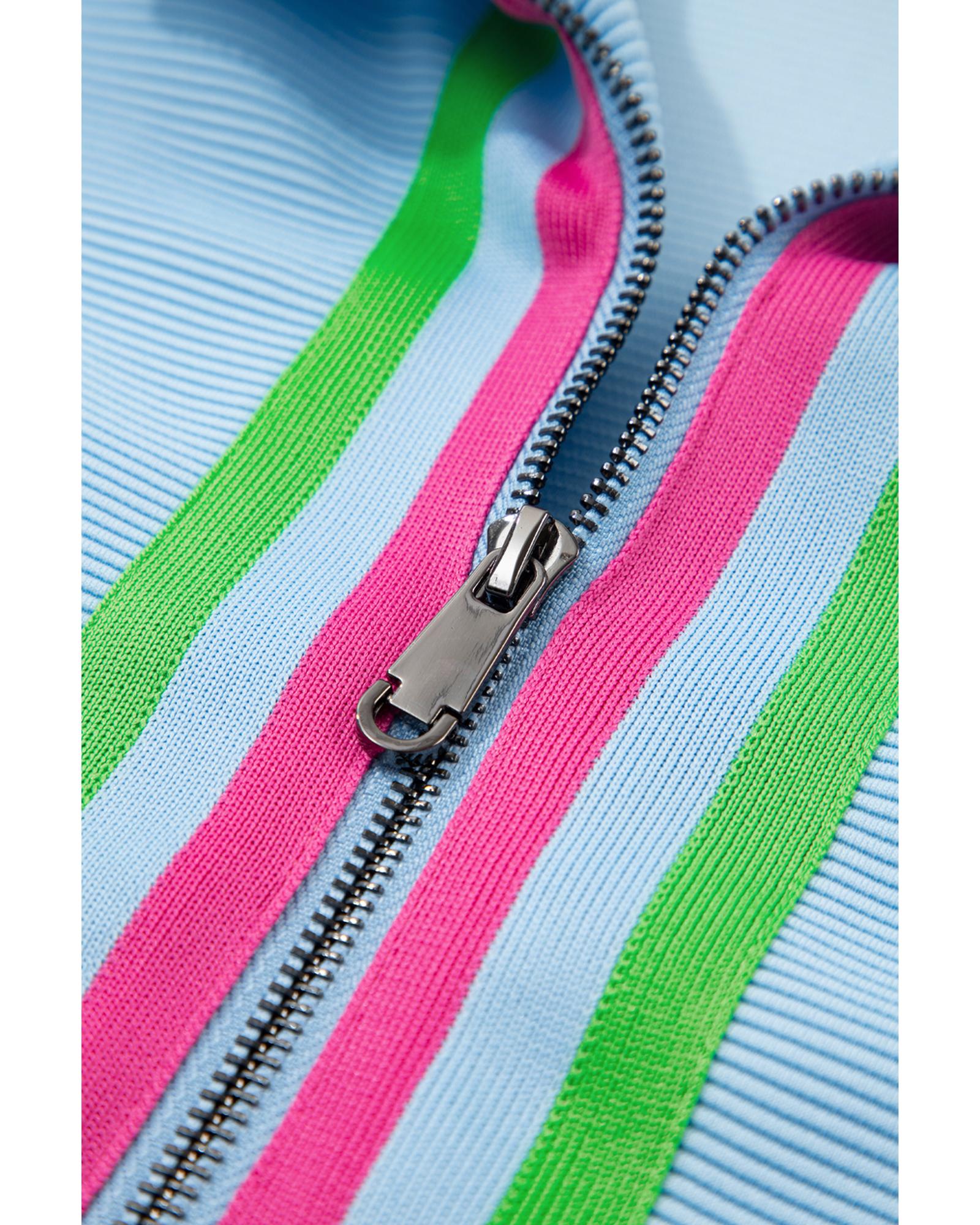- Top features a zipped collar with striped detail