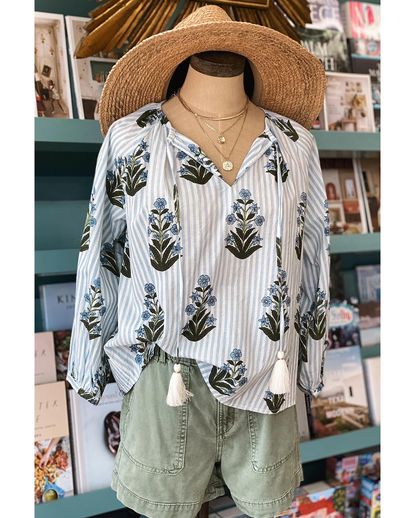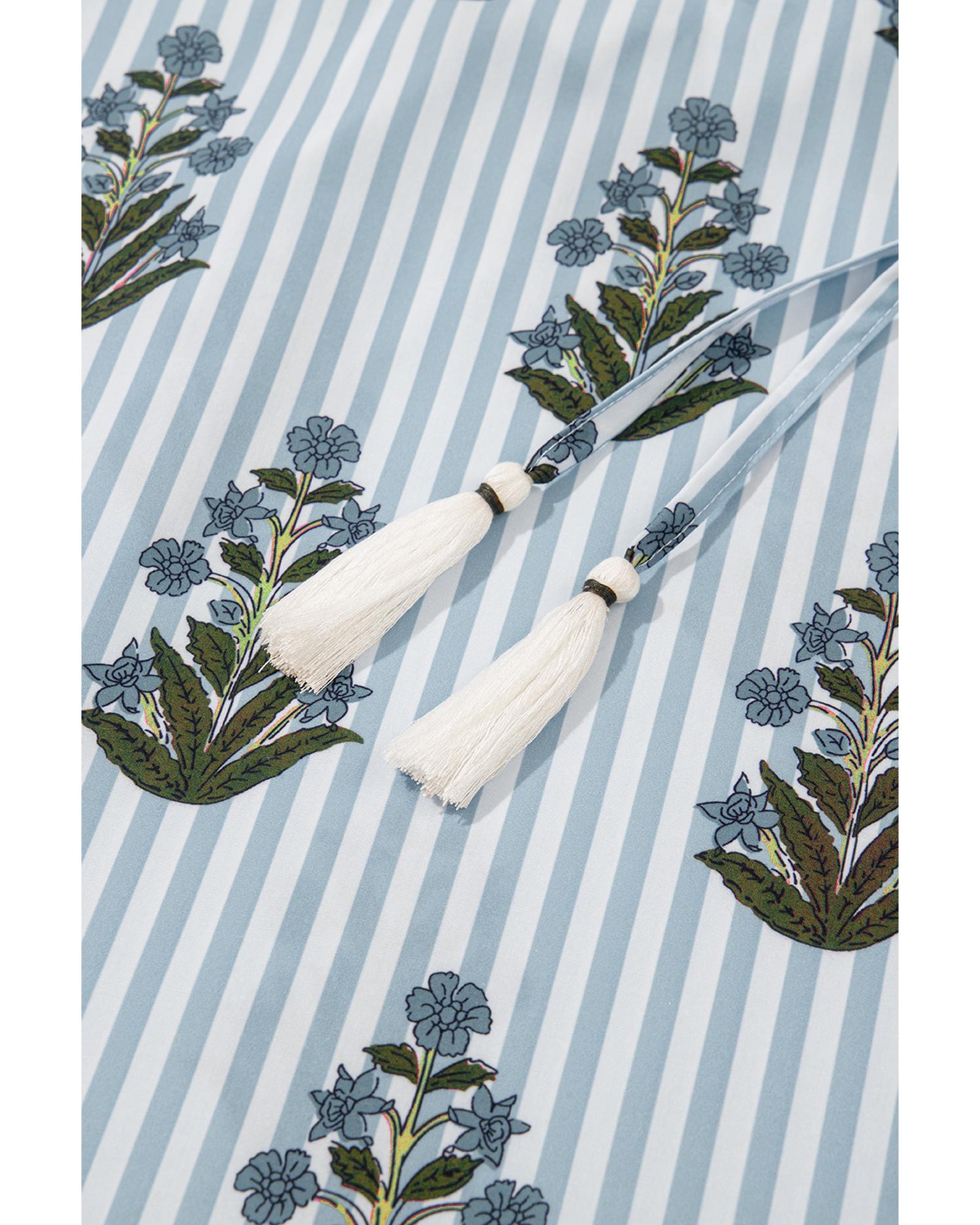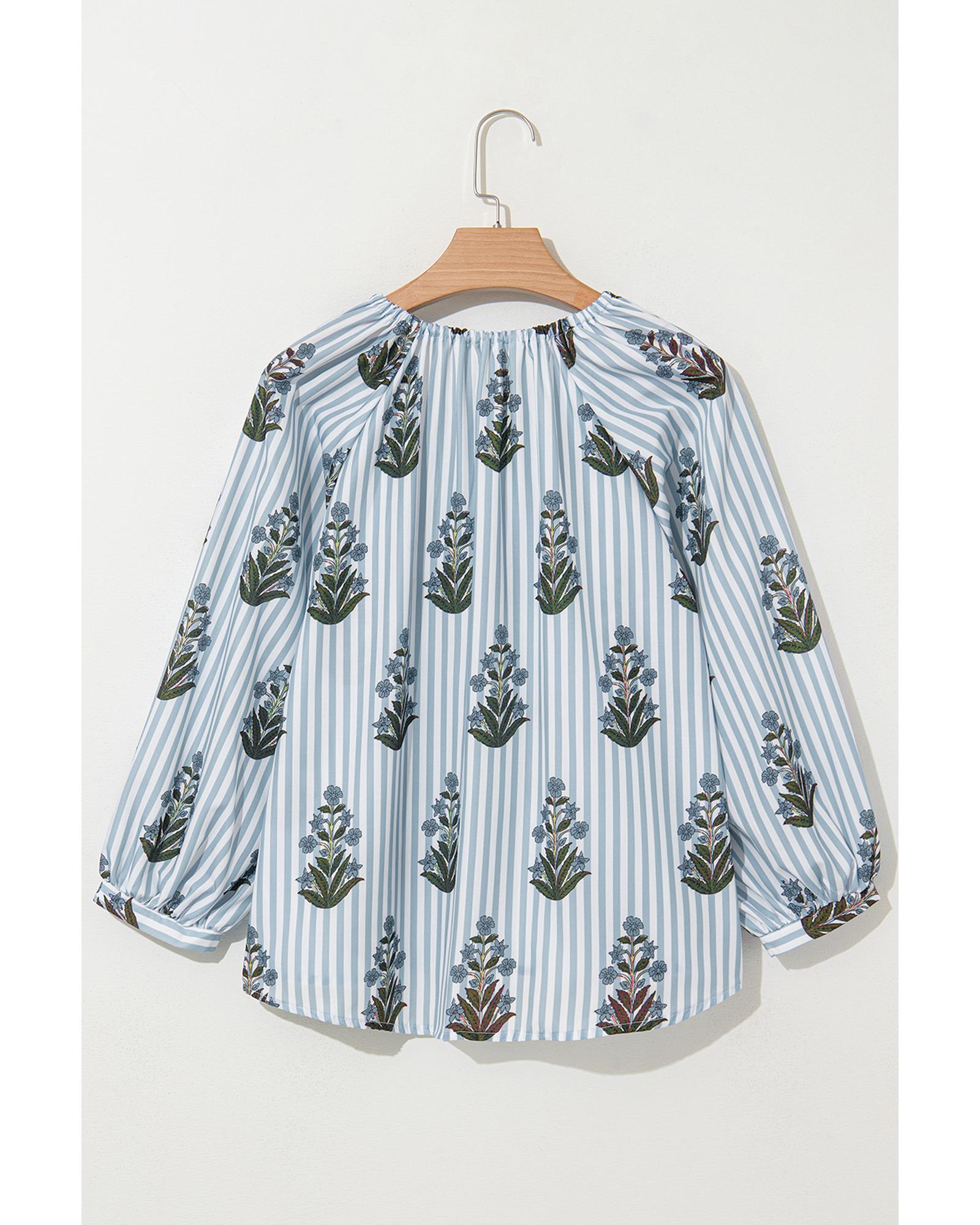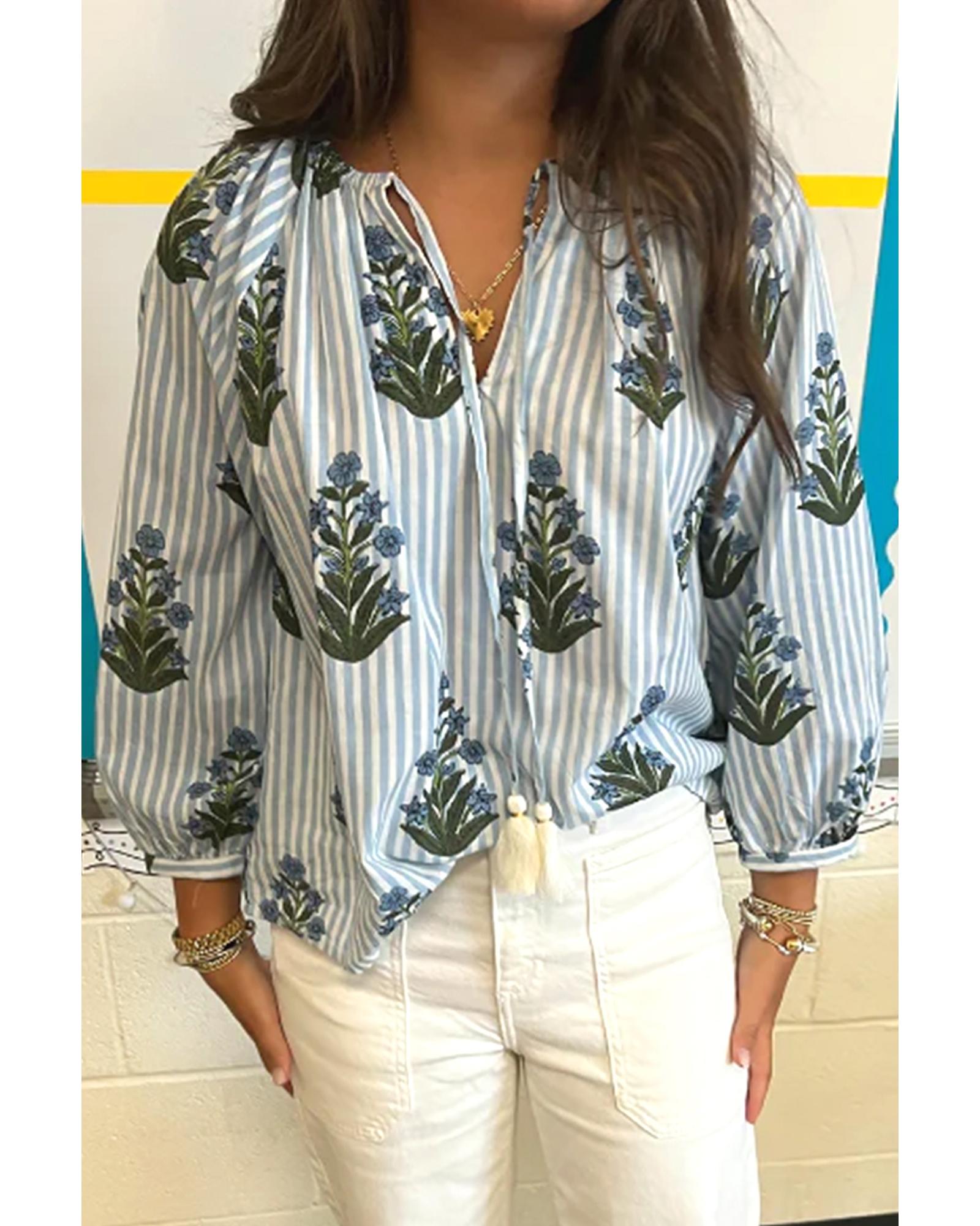 Beau Blue Striped Floral Printed Long Sleeve Tied V Neck Blouse – XL