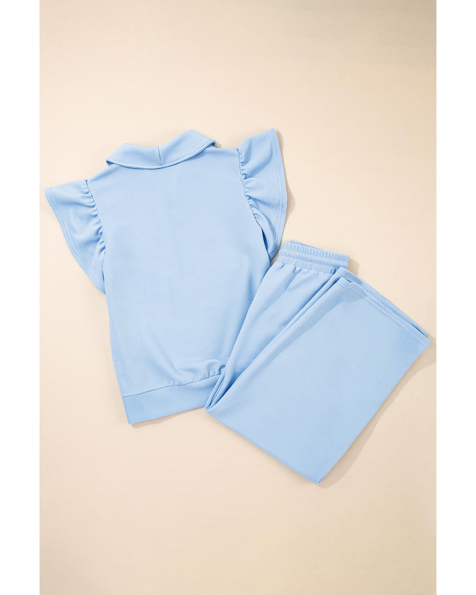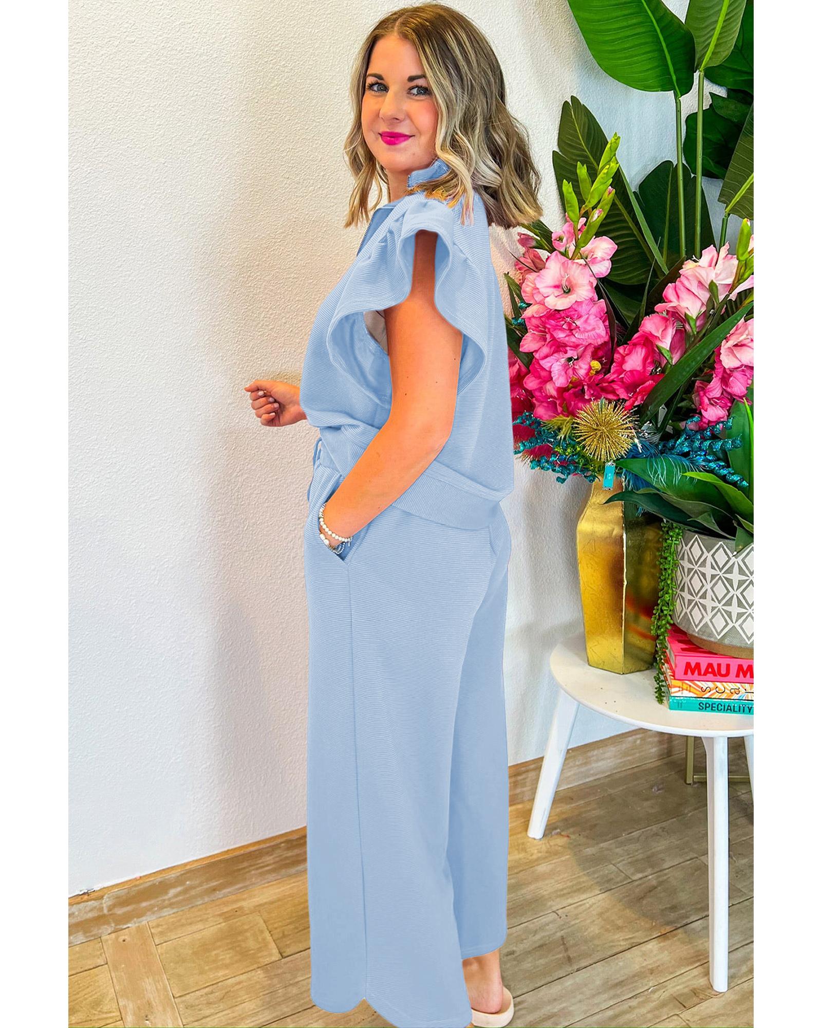 Beau Blue Textured Ruffled Sleeve Zipped Top and Wide Leg Pants Set - S Original price was: $81.99.Current price is: $44.99.