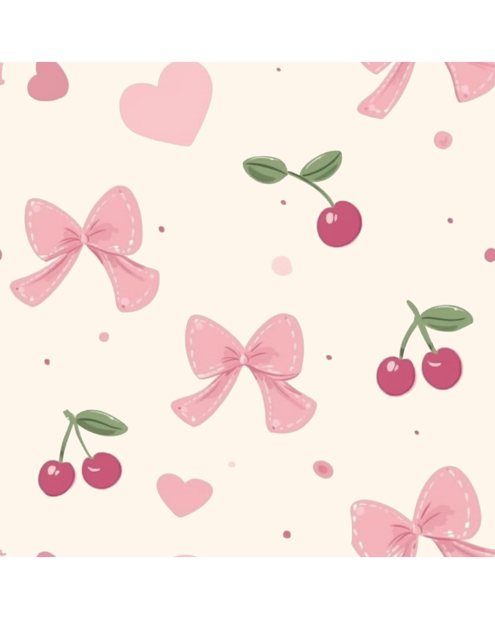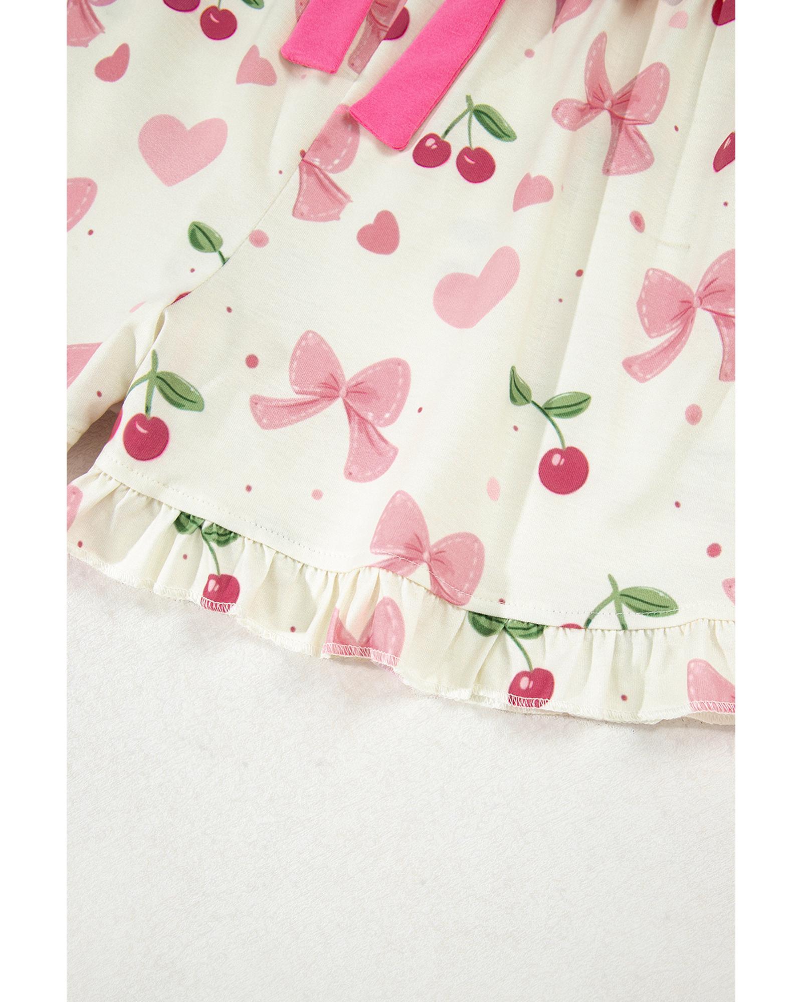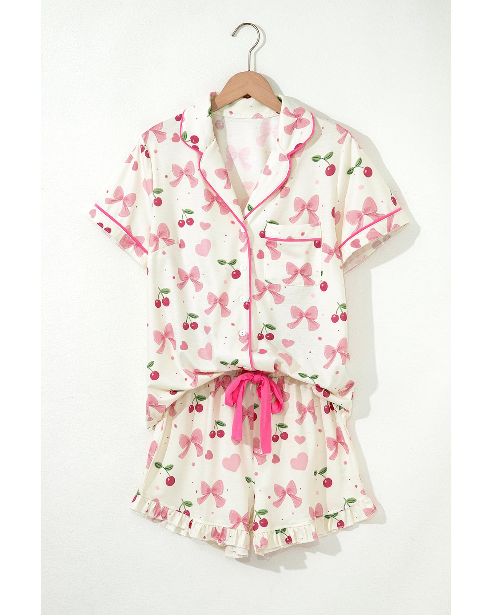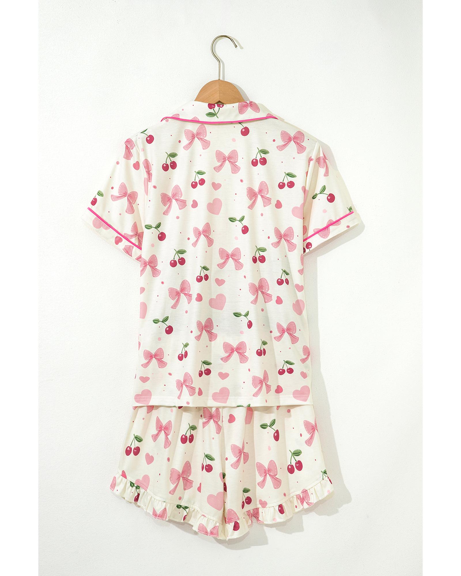 Beige Bow Fruit Print Contrast Pipping Short Pajamas Set – M