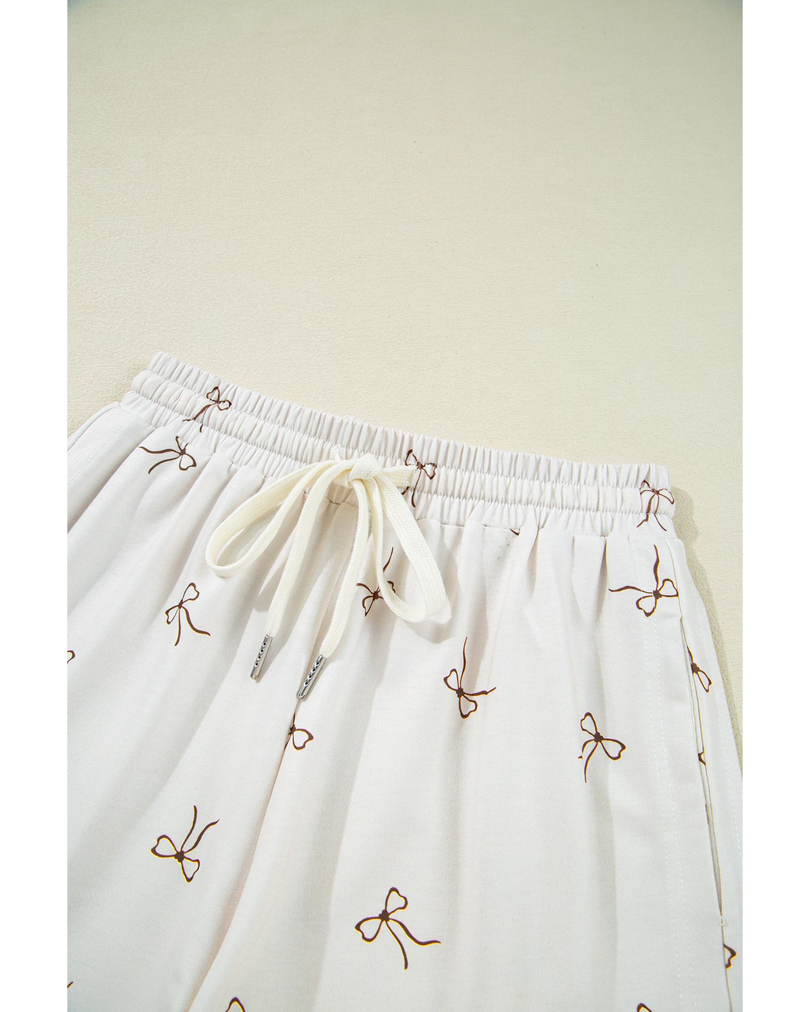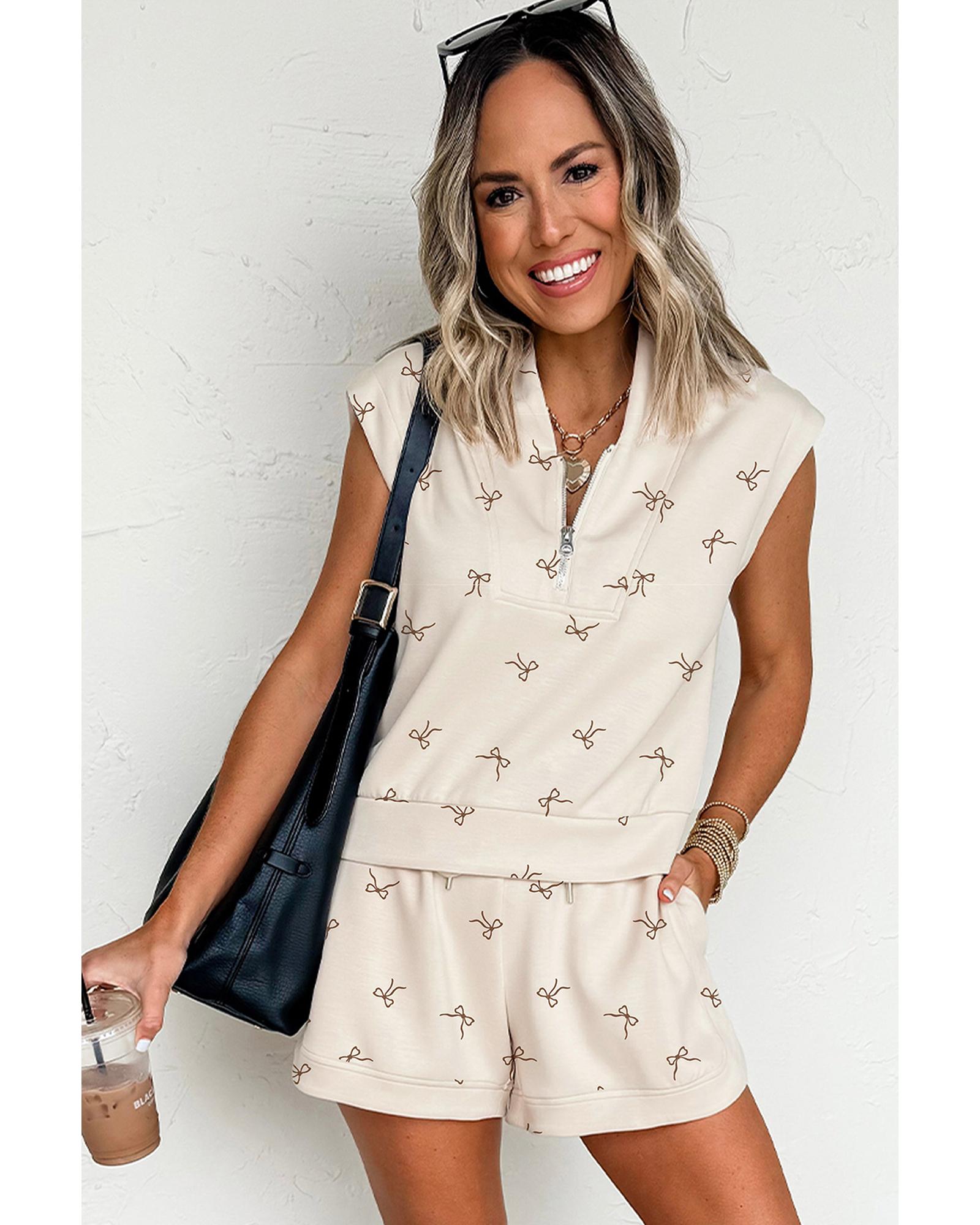 - Beige Bow Print Half Zip Tank and Shorts 2pcs Set