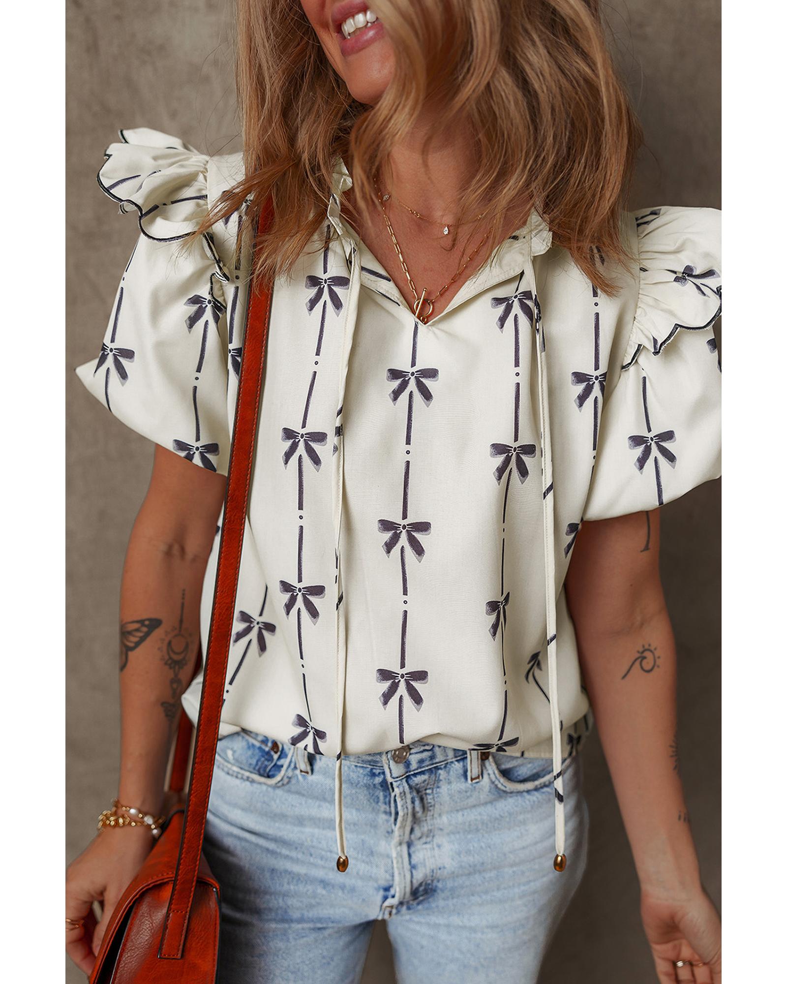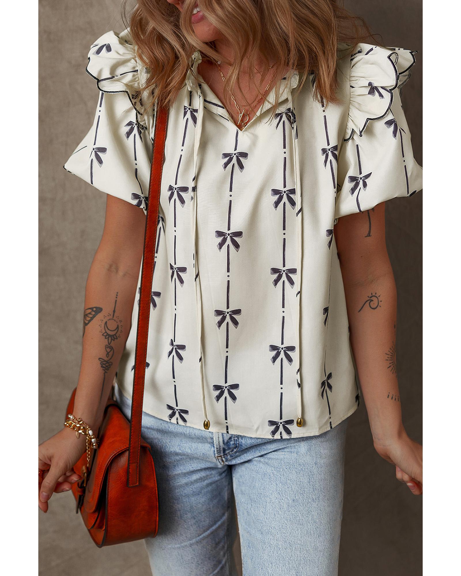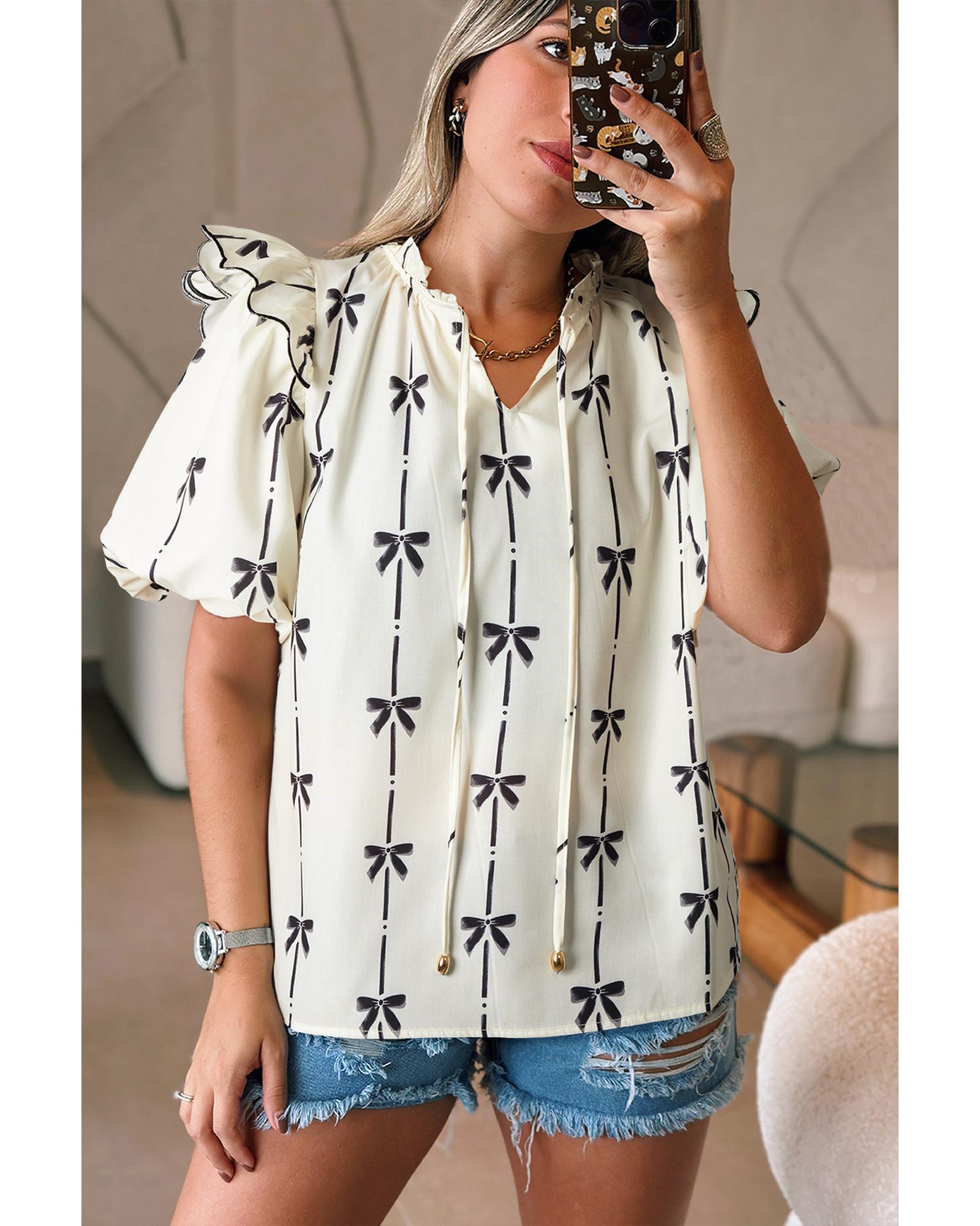 Beige Bow Printed Ruffled Bubble Sleeve Tied Notched V Neck Blouse – XL