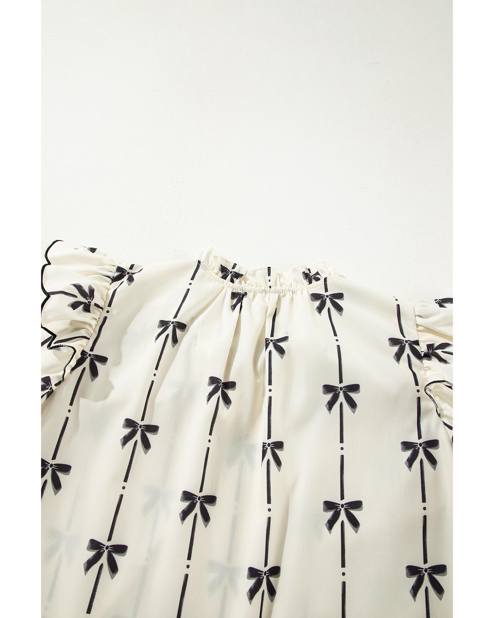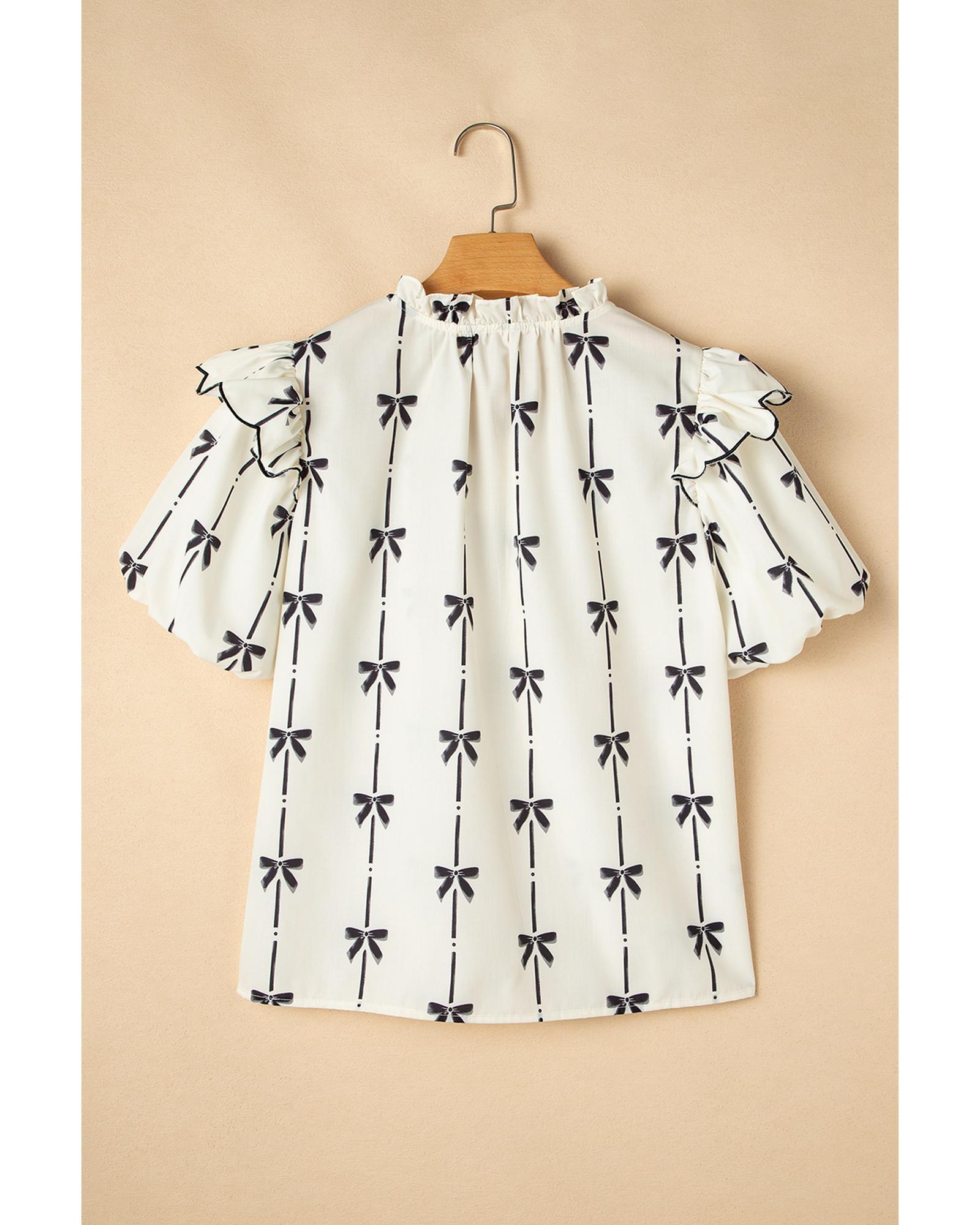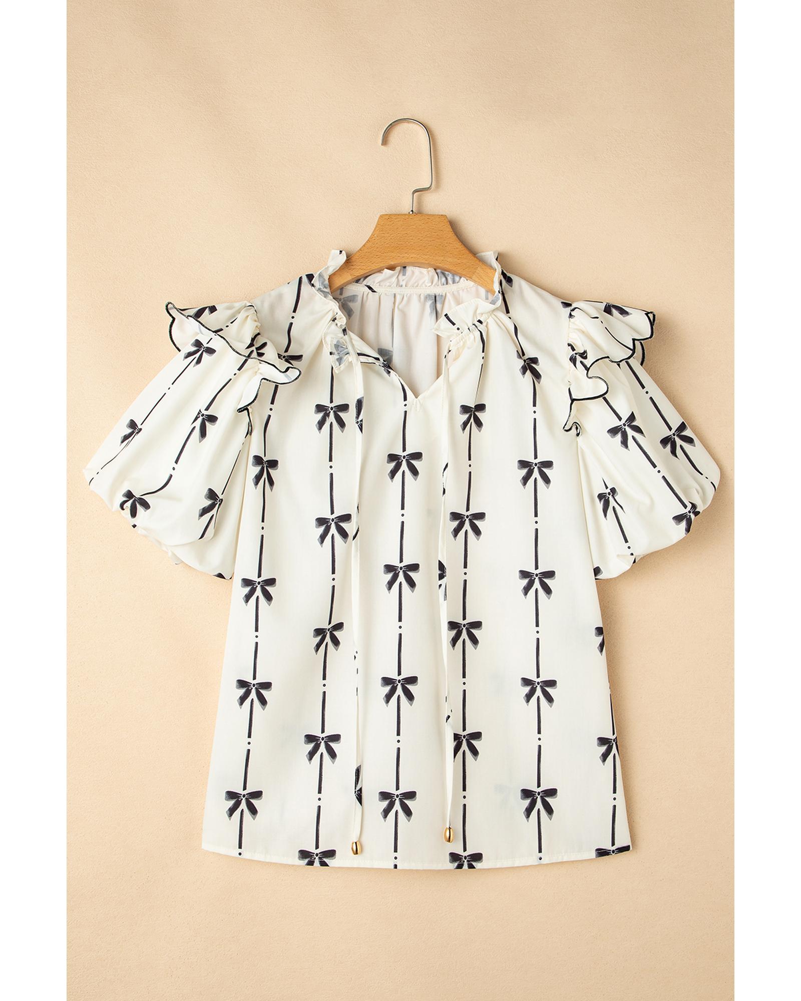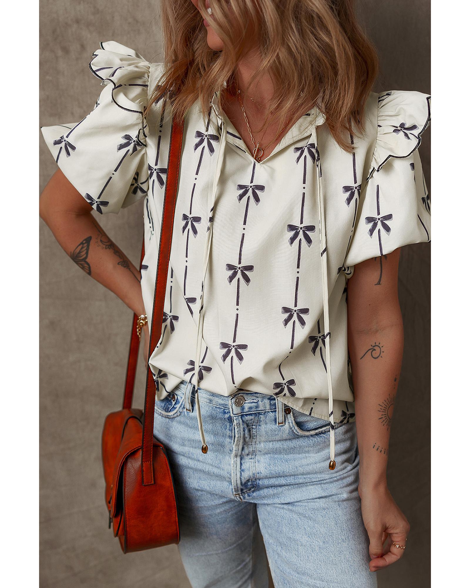 Beige Bow Printed Ruffled Bubble Sleeve Tied Notched V Neck Blouse – XL