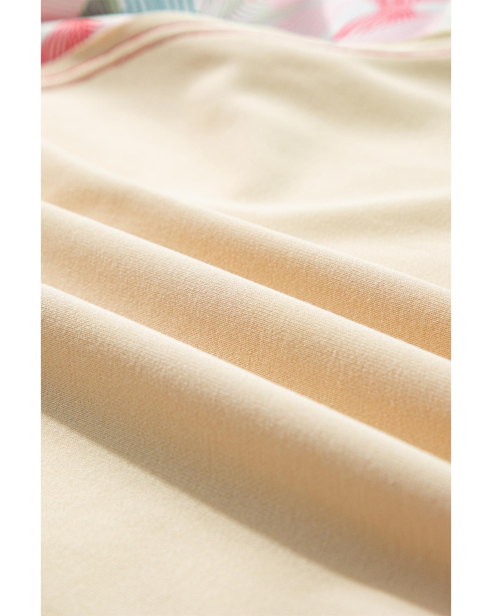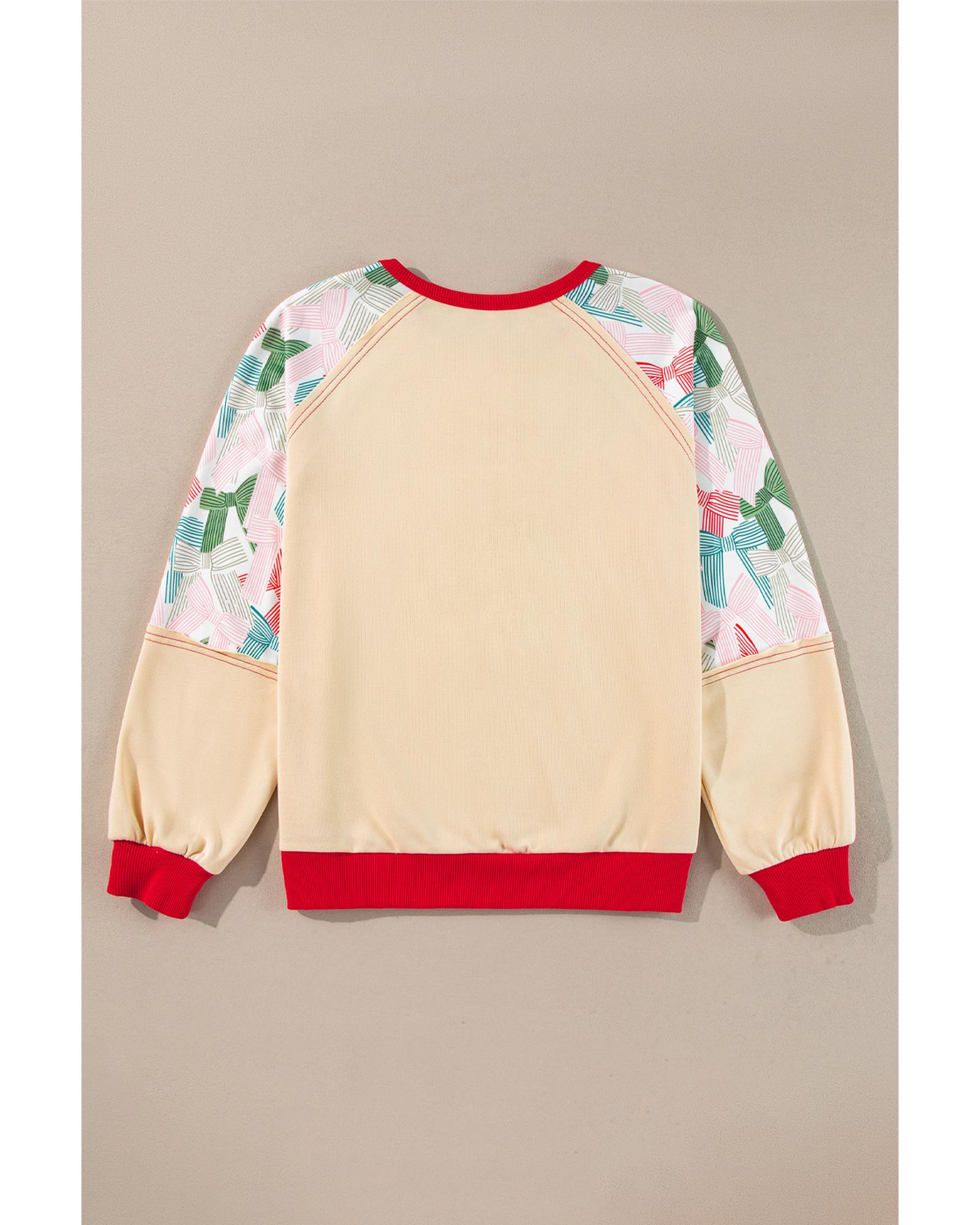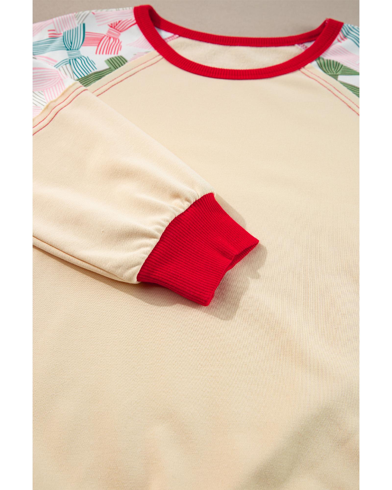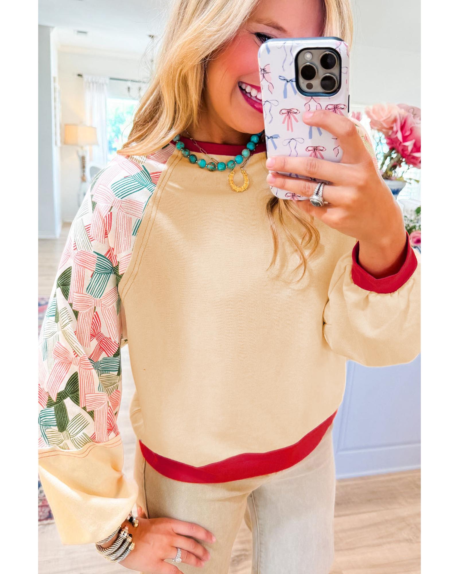 Beige Bowknot Printed Patchwork Raglan Sleeve Colorblock Edge Top – M