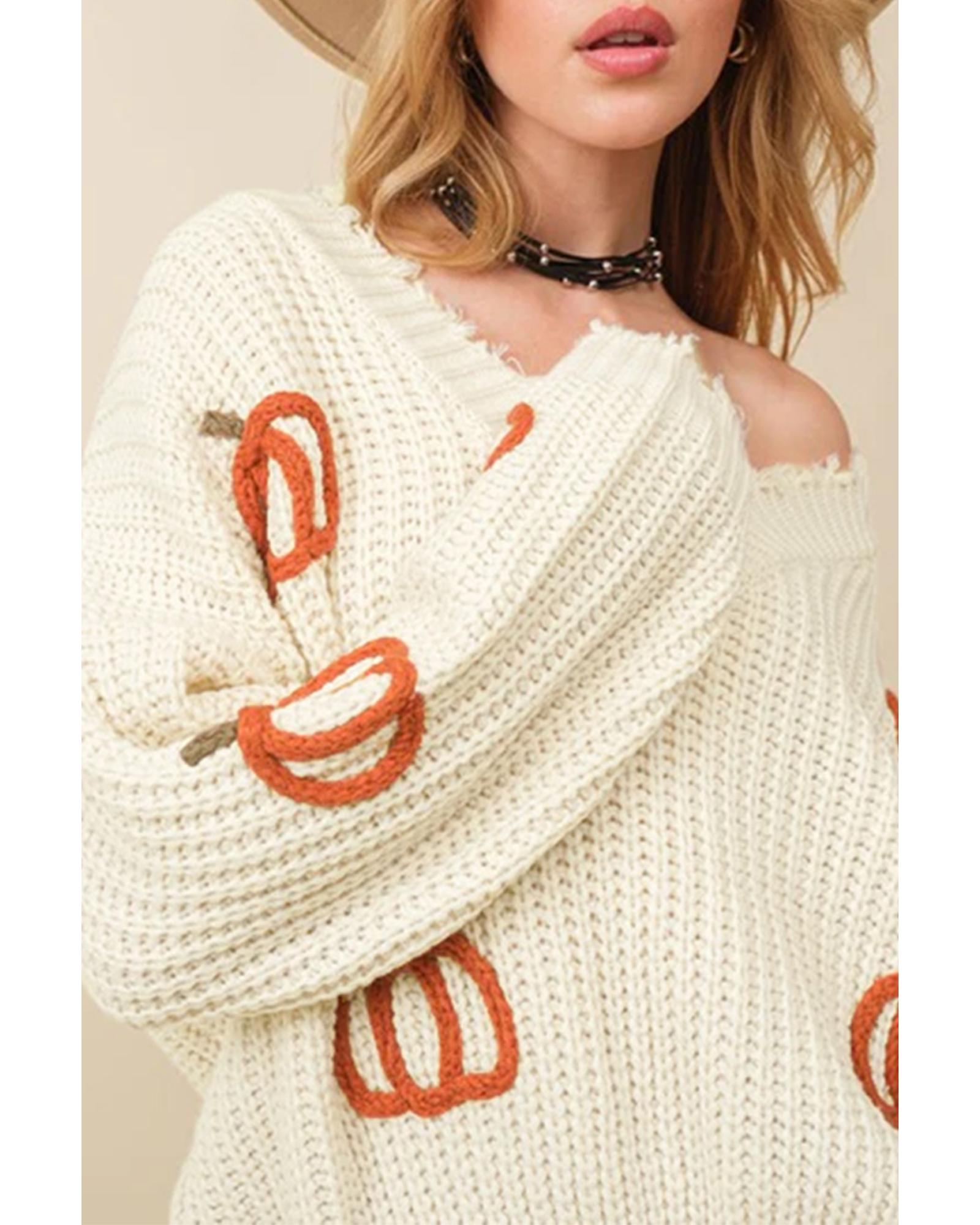 Beige Cable Knit Pumpkin Raw Hem V Neck Loose Sweater – S