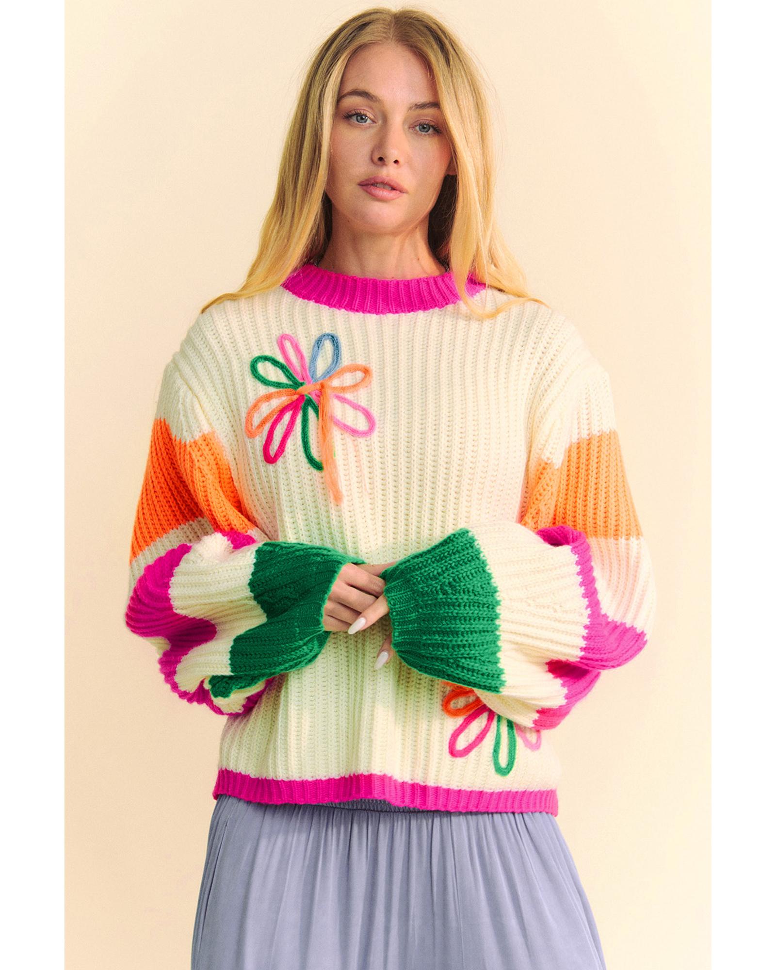 Beige Colorblock Flower Print Cable Knit Loose Sweater – L