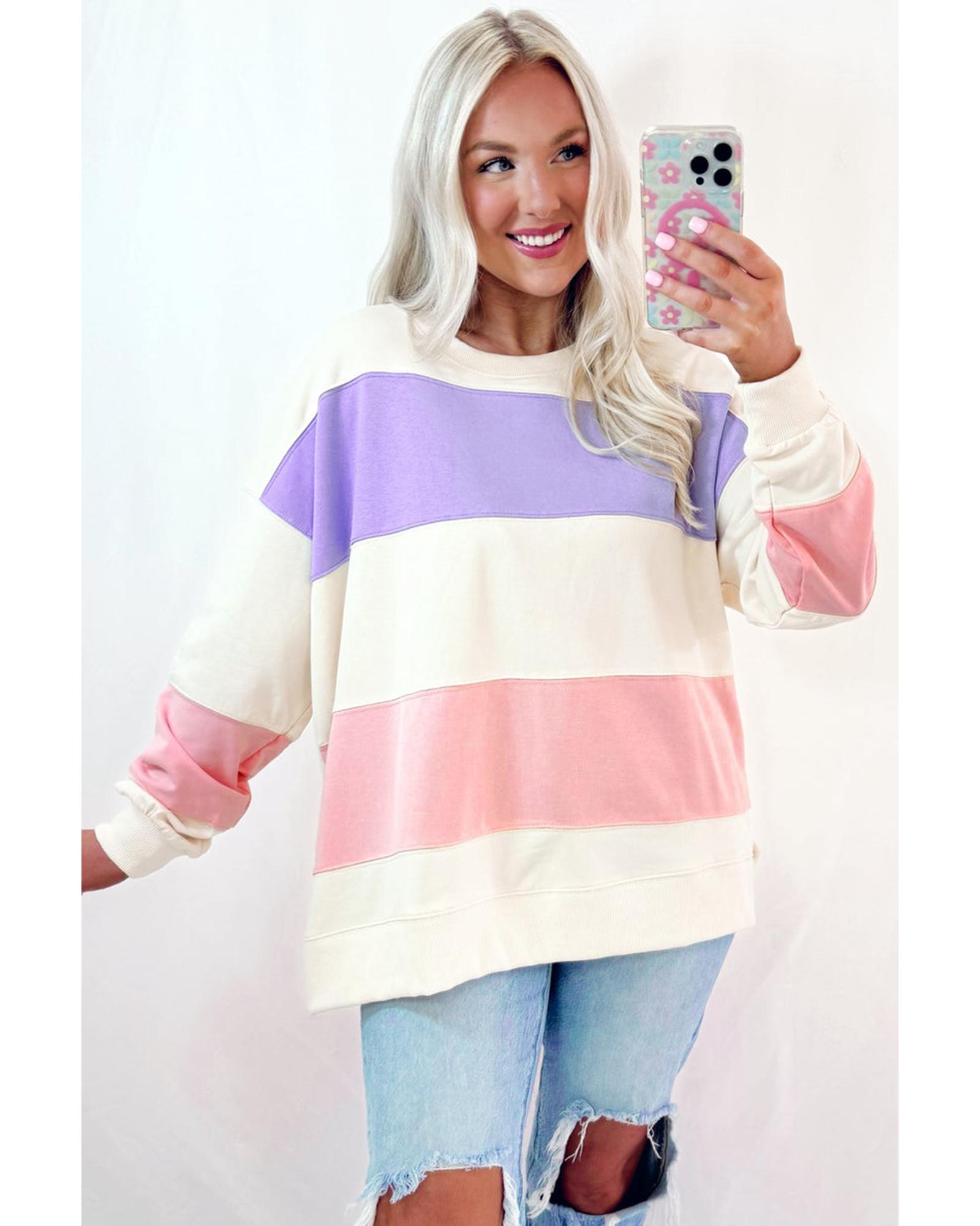Beige Colorblock Patchwork Drop Shoulder Crewneck Sweatshirt – S