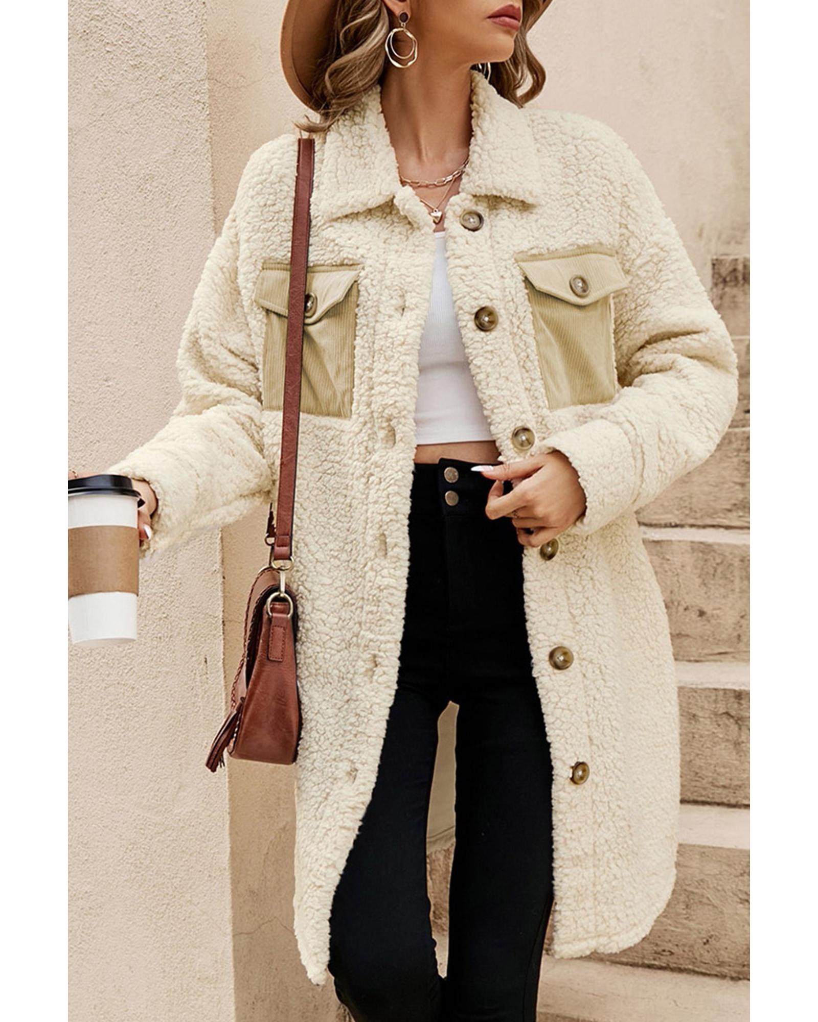 - Beige Contrast Flap Pocket Single Breasted Teddy Coat