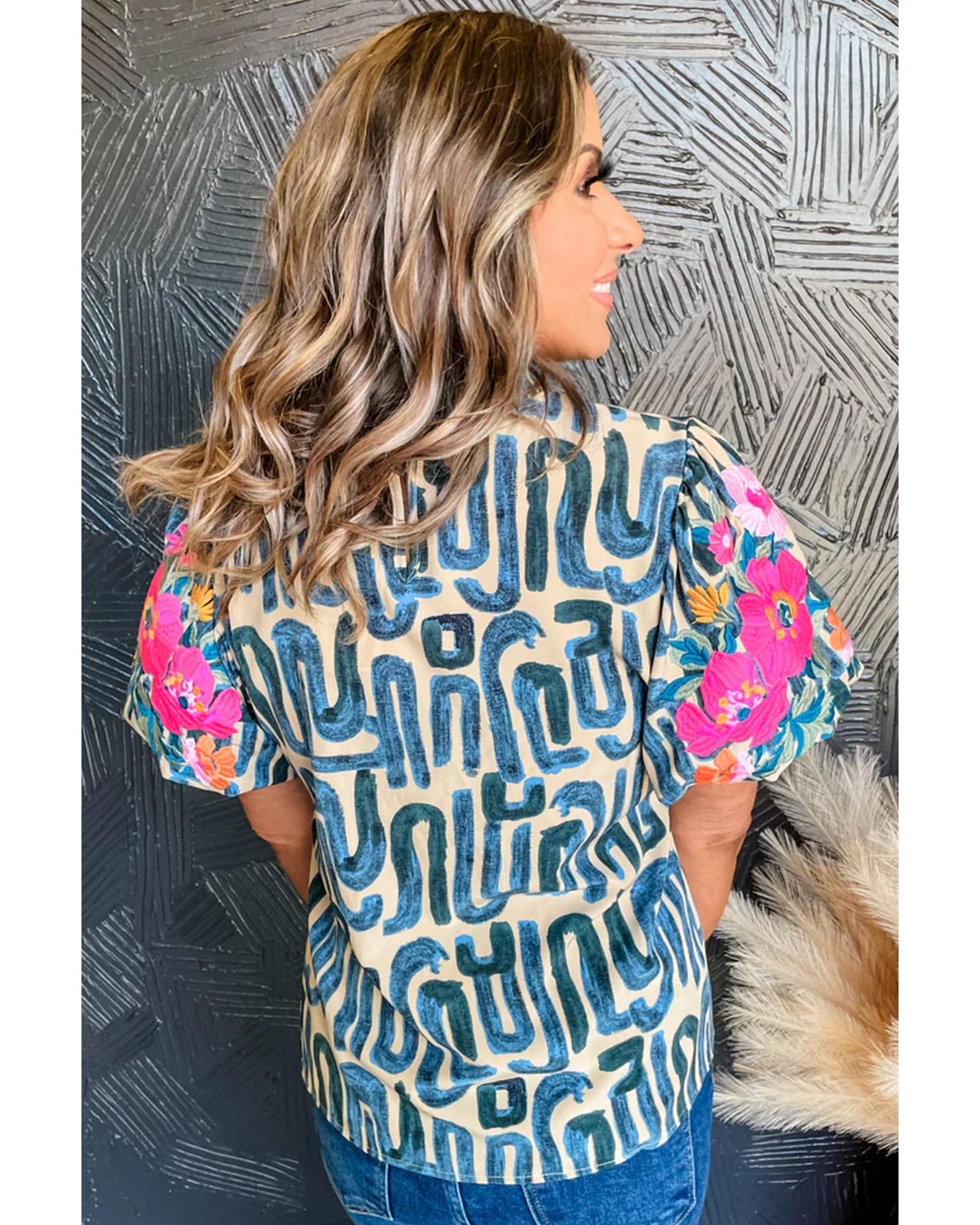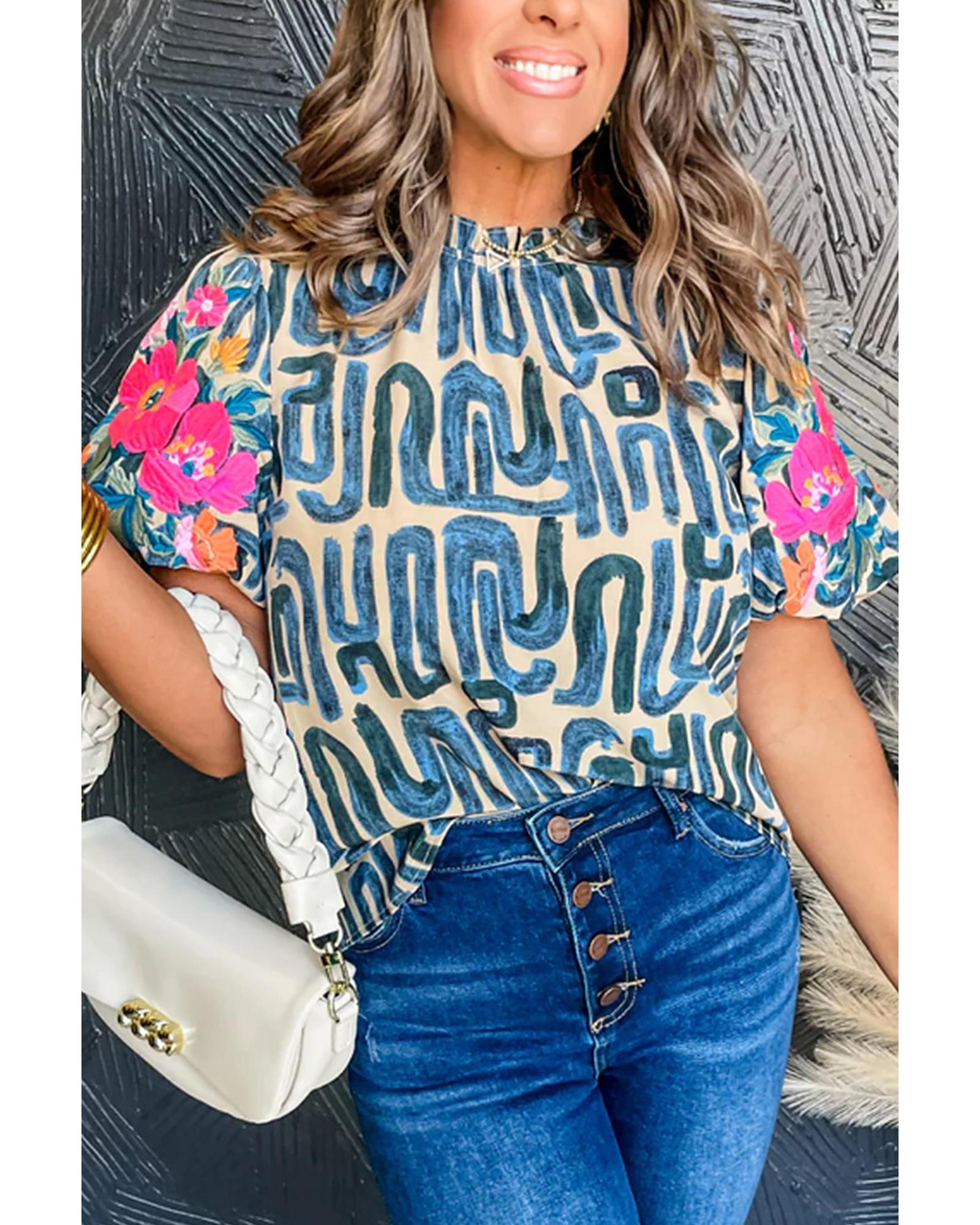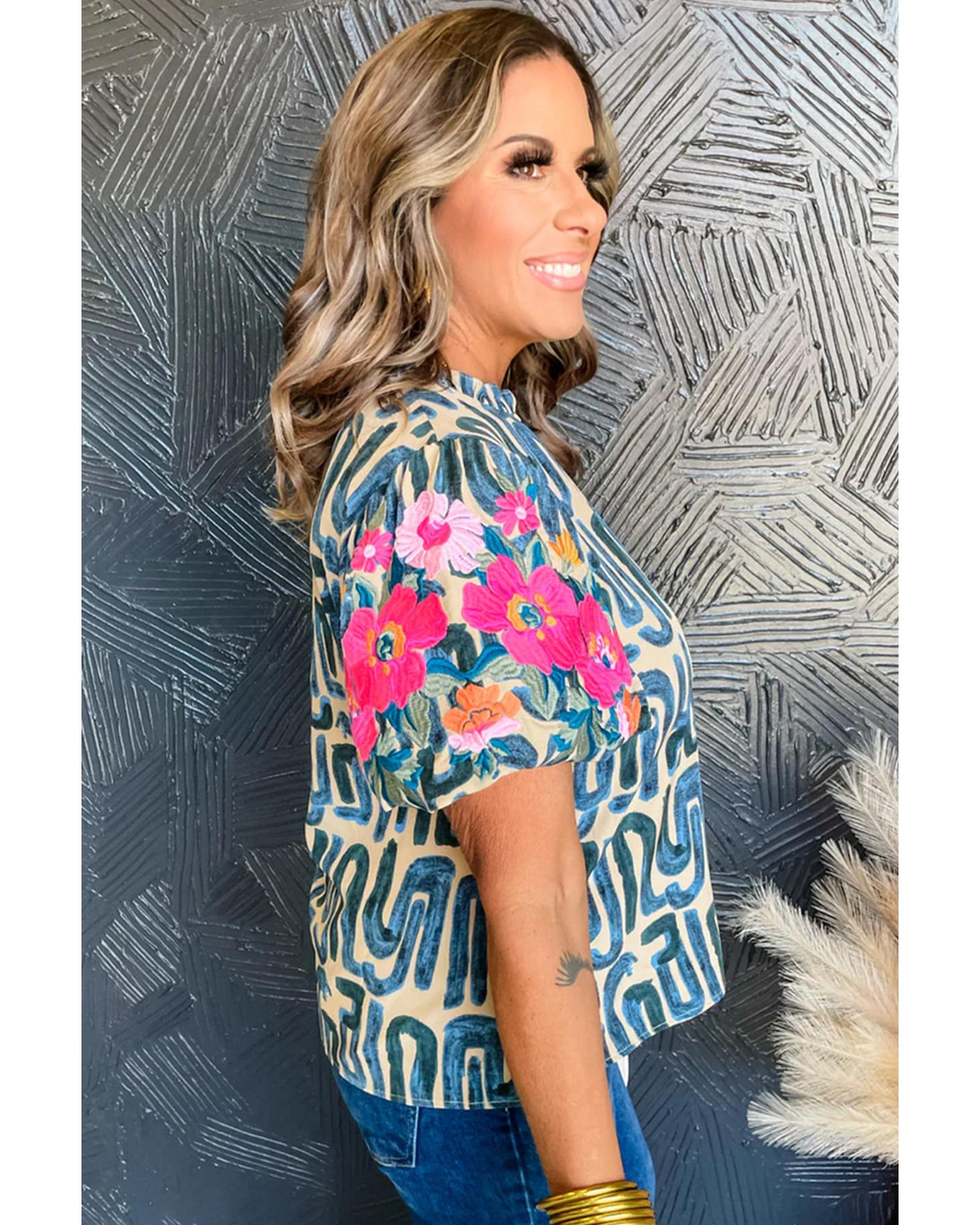 Beige Embroidered Puff Sleeve Frilled Neck Printed Top – M