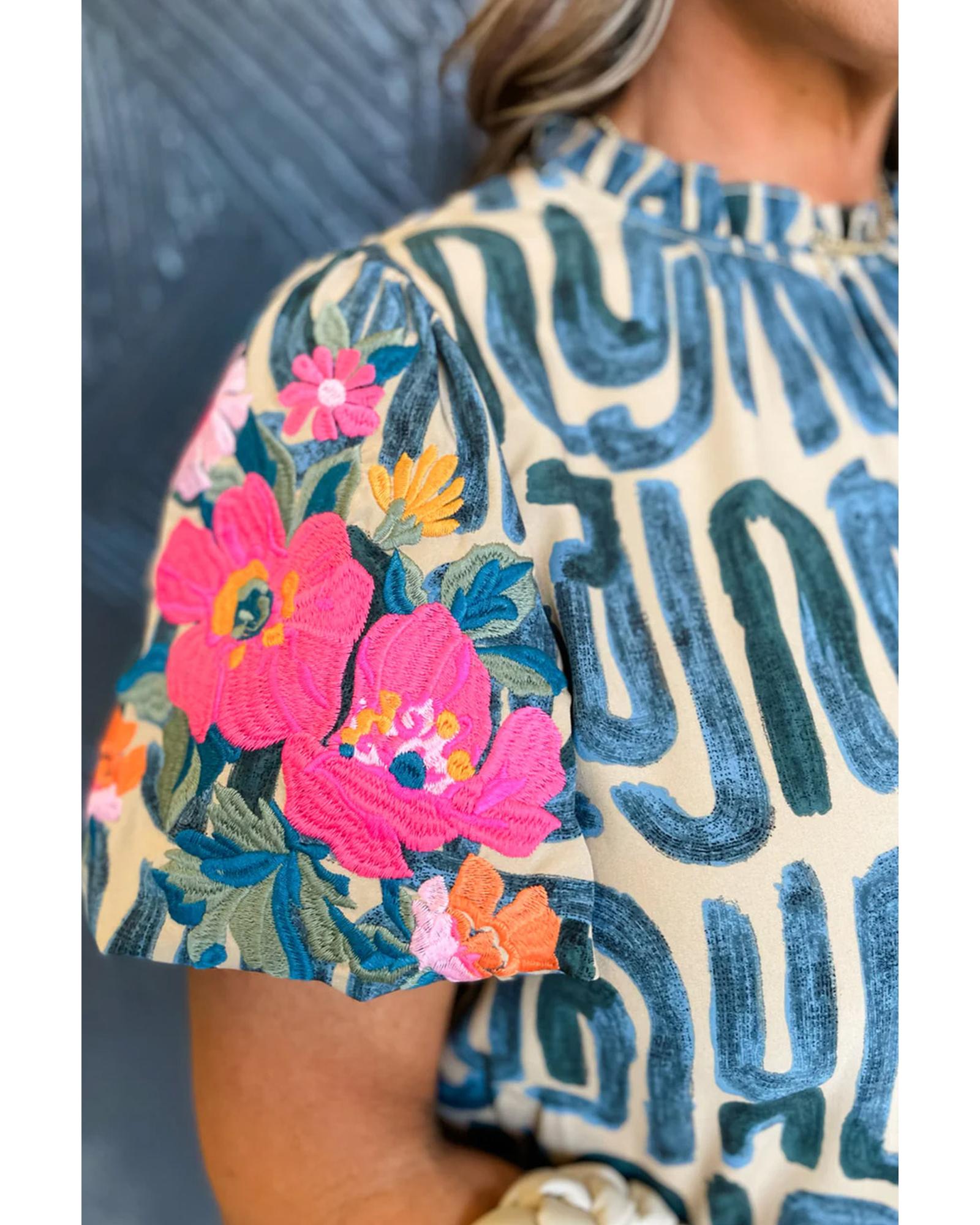 Beige Embroidered Puff Sleeve Frilled Neck Printed Top – S