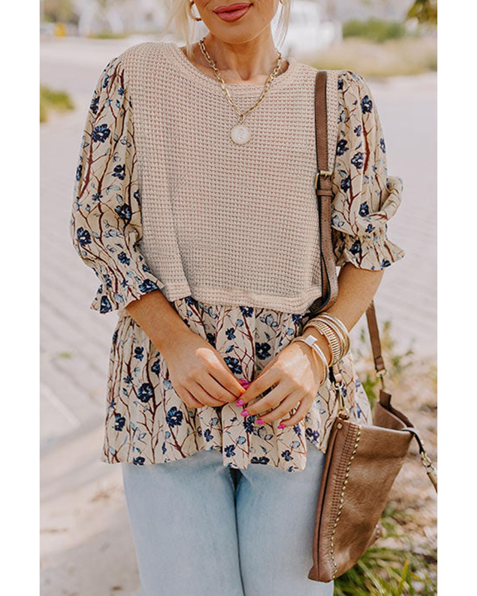 Beige Faux Two Piece Knit Patchwork Floral Print Plus Size Top – 1X