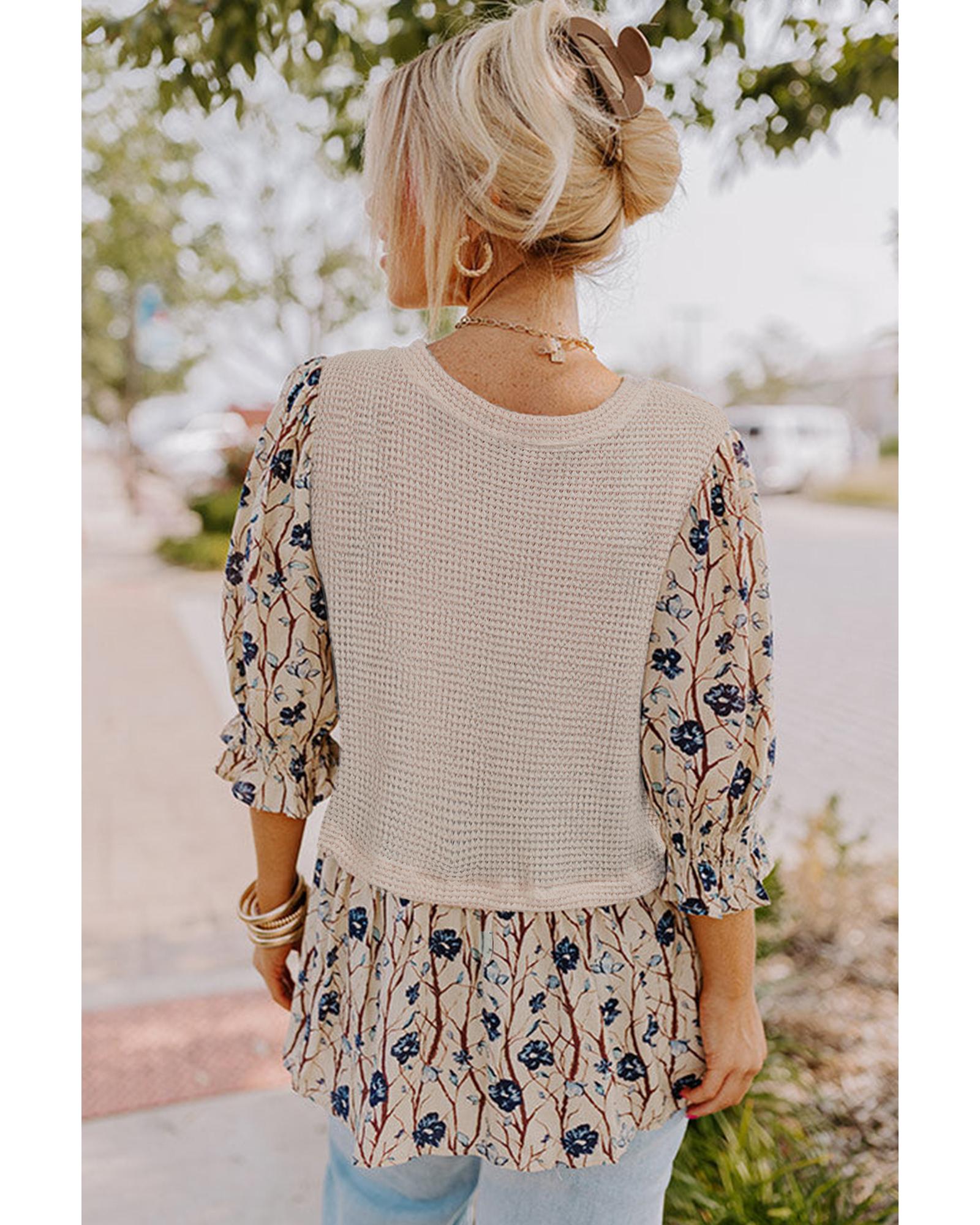 Beige Faux Two Piece Knit Patchwork Floral Print Plus Size Top - 2X