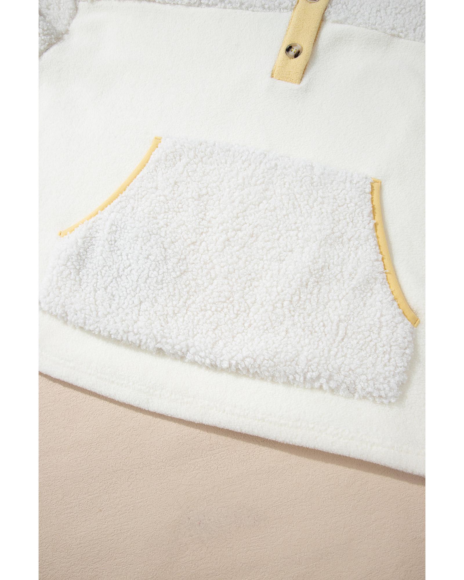 Beige Fleece Colorblock Trim Buttons Collar Sweatshirt with Pocket – L