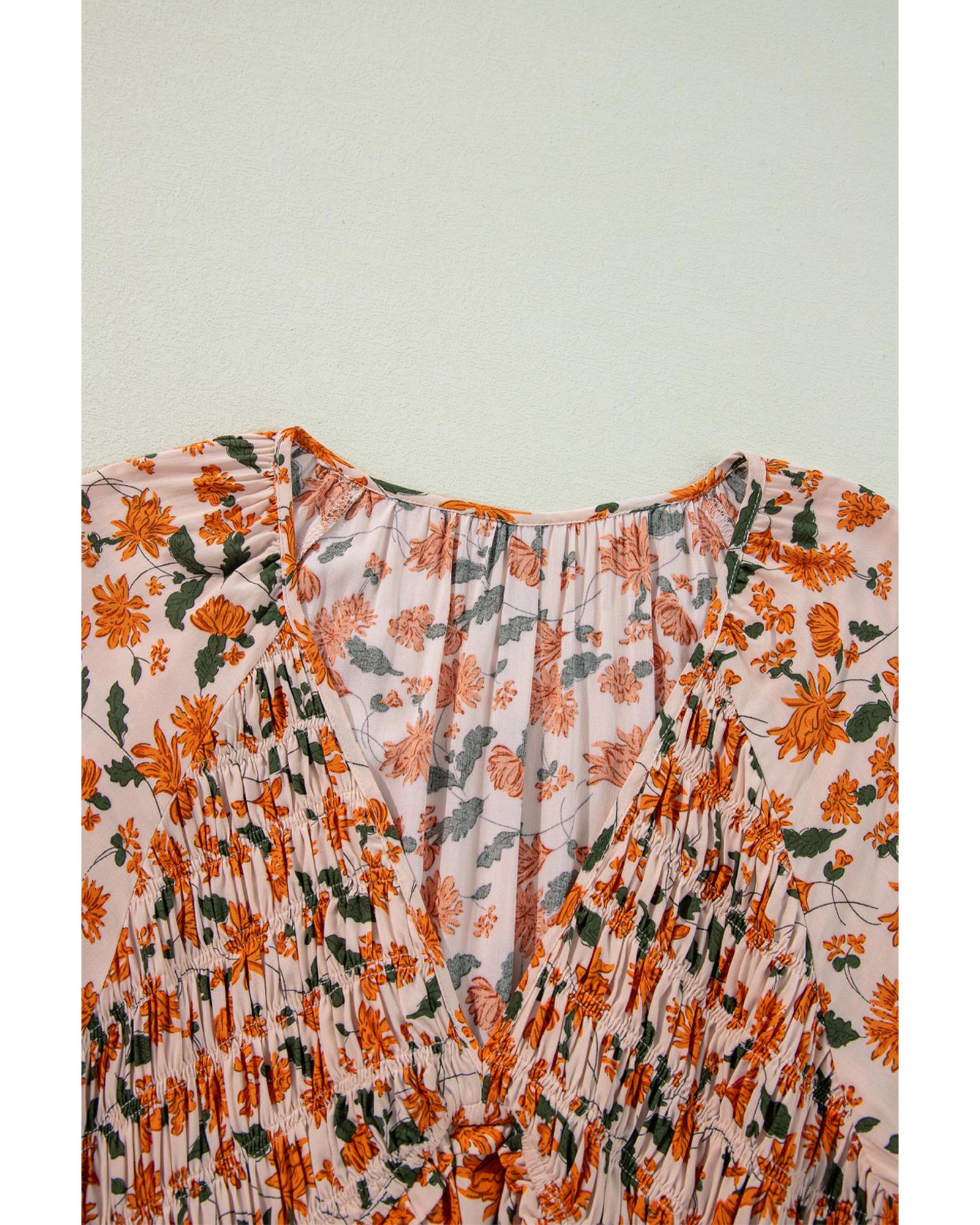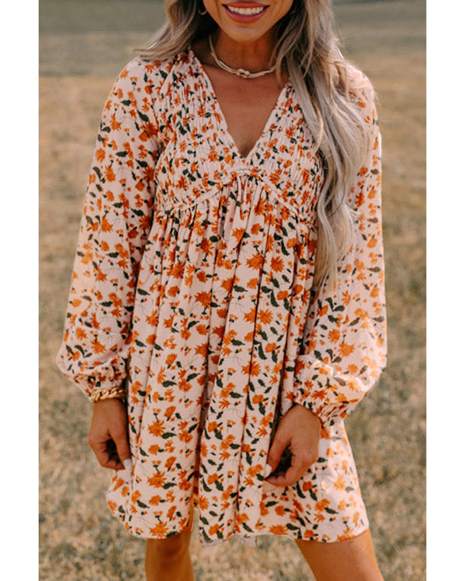 • Beige Floral Deep V Neck Smocked Bust Bubble Sleeve Babydoll Dress