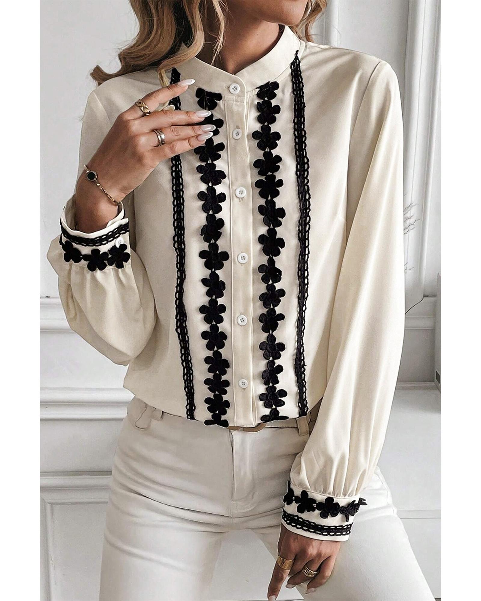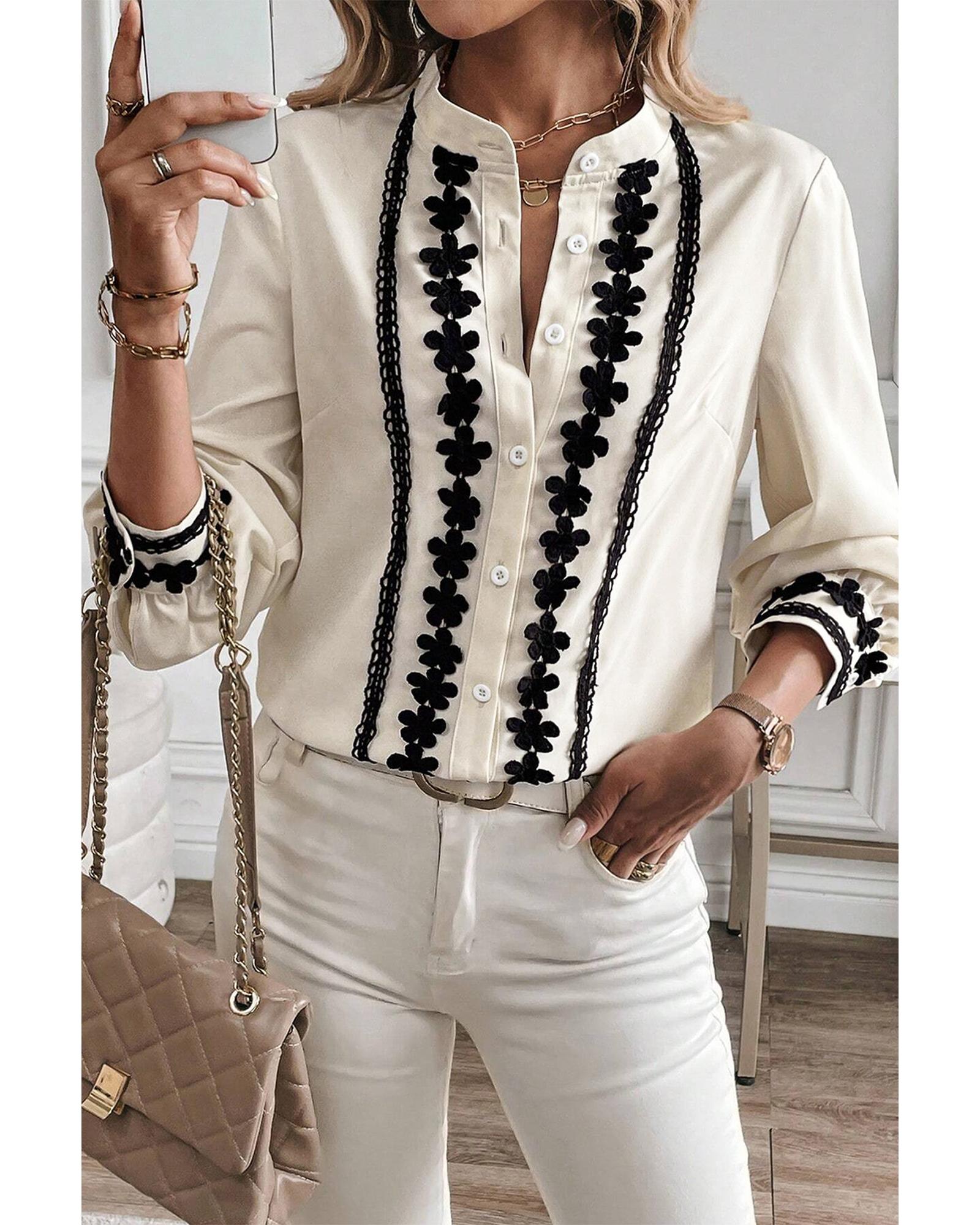 Beige Floral Embroidered Stand Neck Buttoned Shirt – S