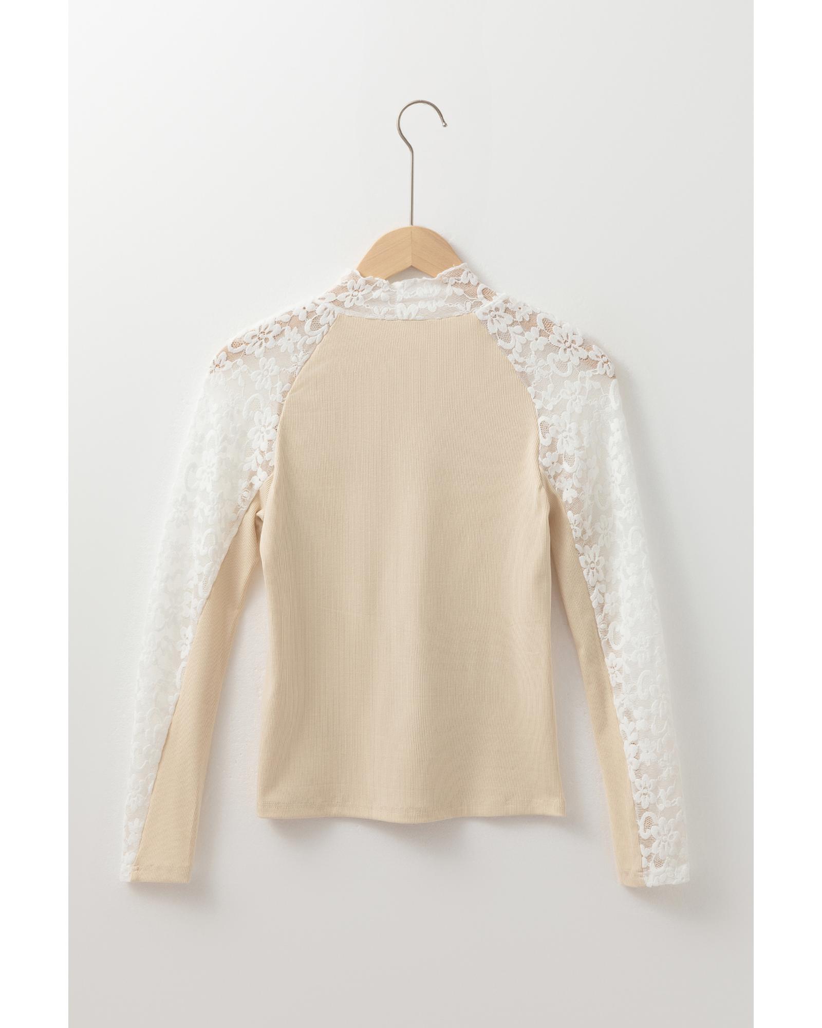 Beige Floral Lace Patchwork Long Sleeve High Neck Slim Top – XL
