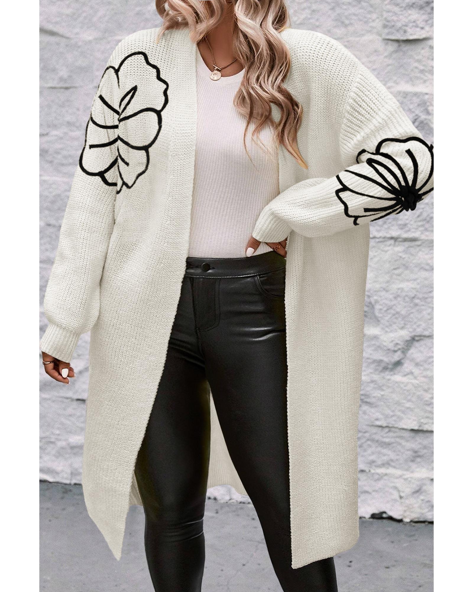 - Beige Flower Embroidered Drop Shoulder Open Front Duster Cardigan