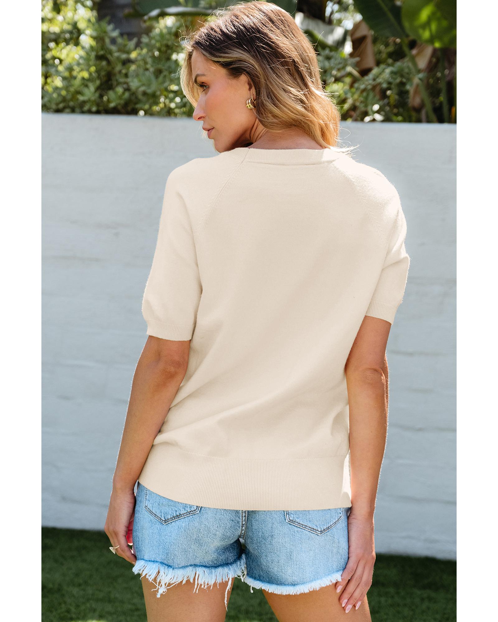 Beige Flower Pattern Short Sleeve Knitted Top – L