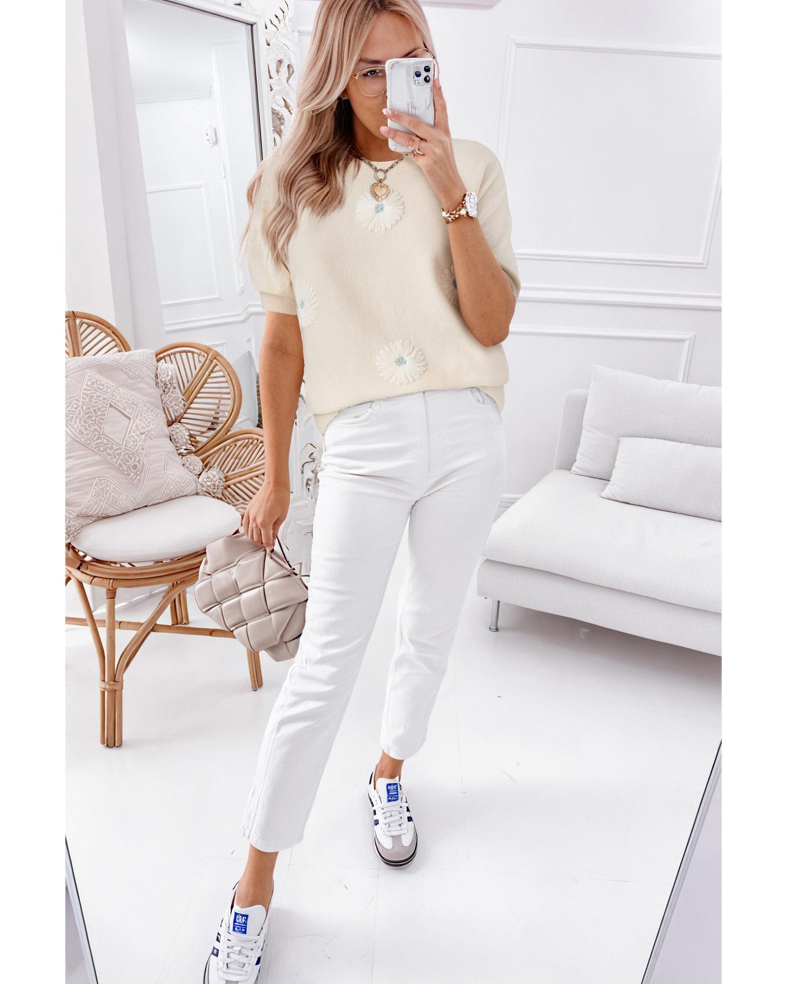 - Beige flower pattern short sleeve knitted top