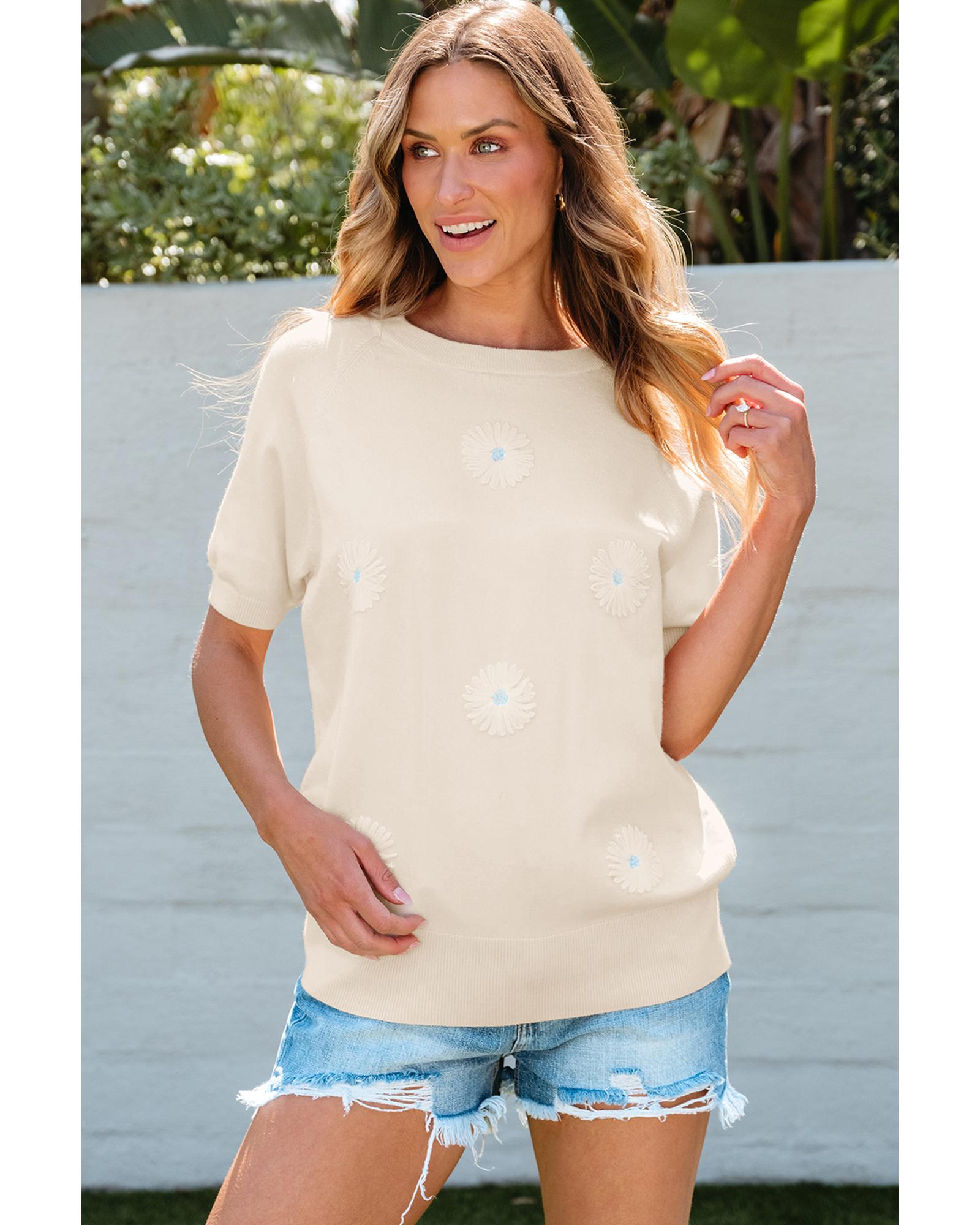 Beige Flower Pattern Short Sleeve Knitted Top – XL
