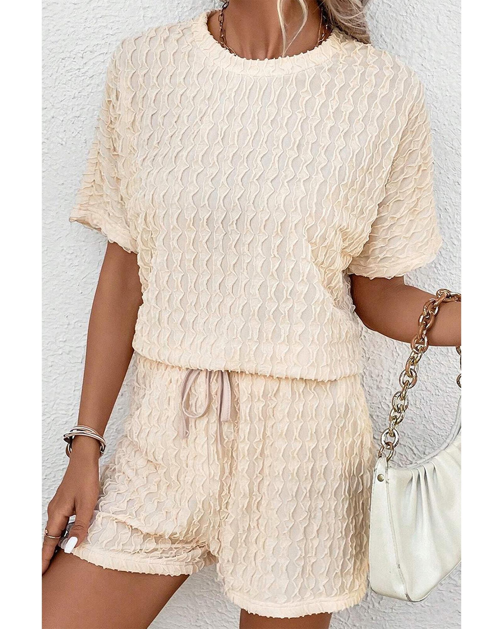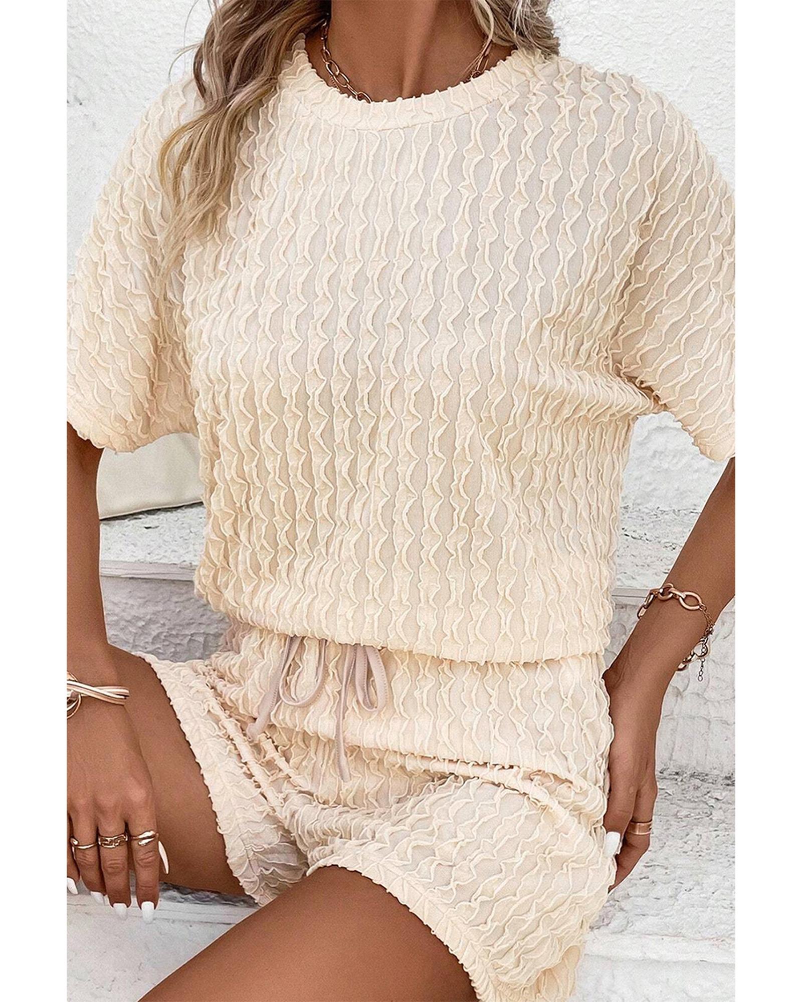 Beige Frill Textured Short Sleeve Top and Drawstring Shorts Set - S