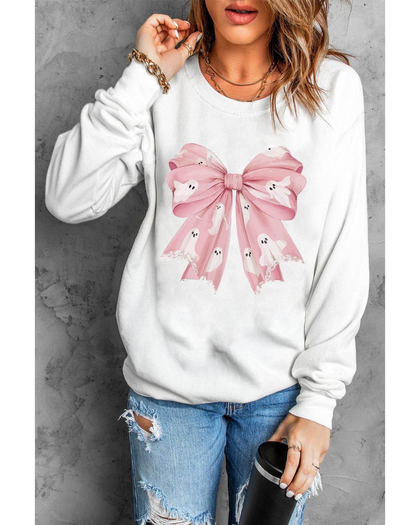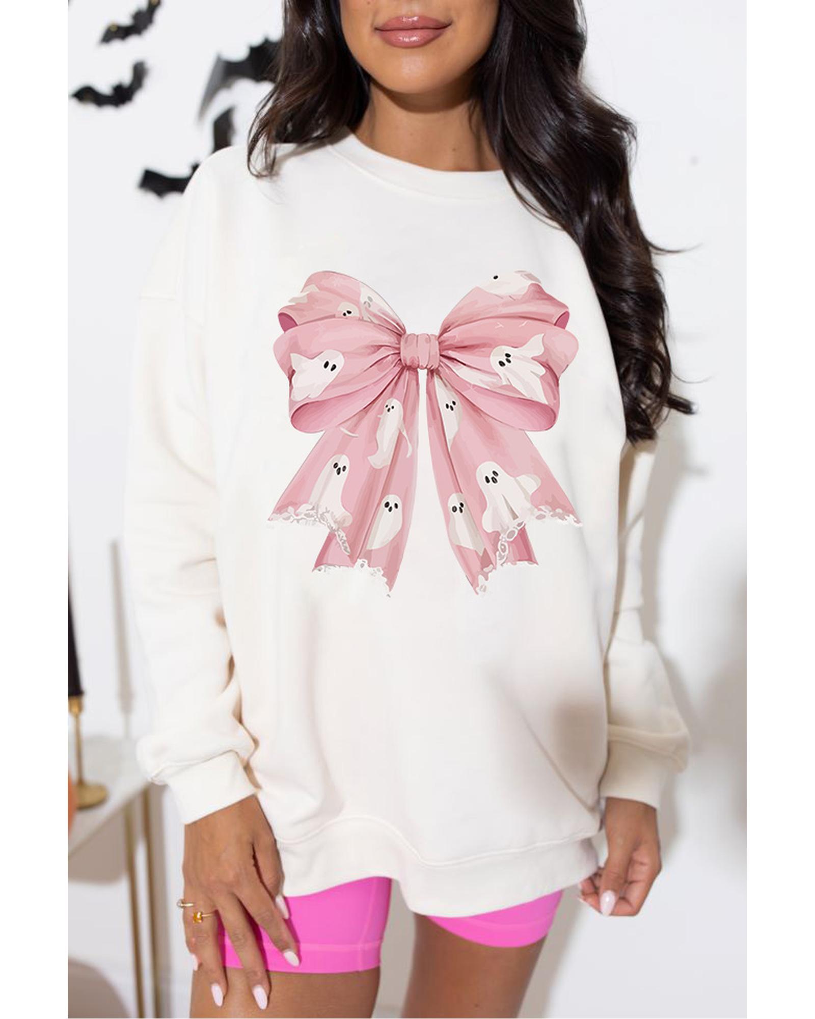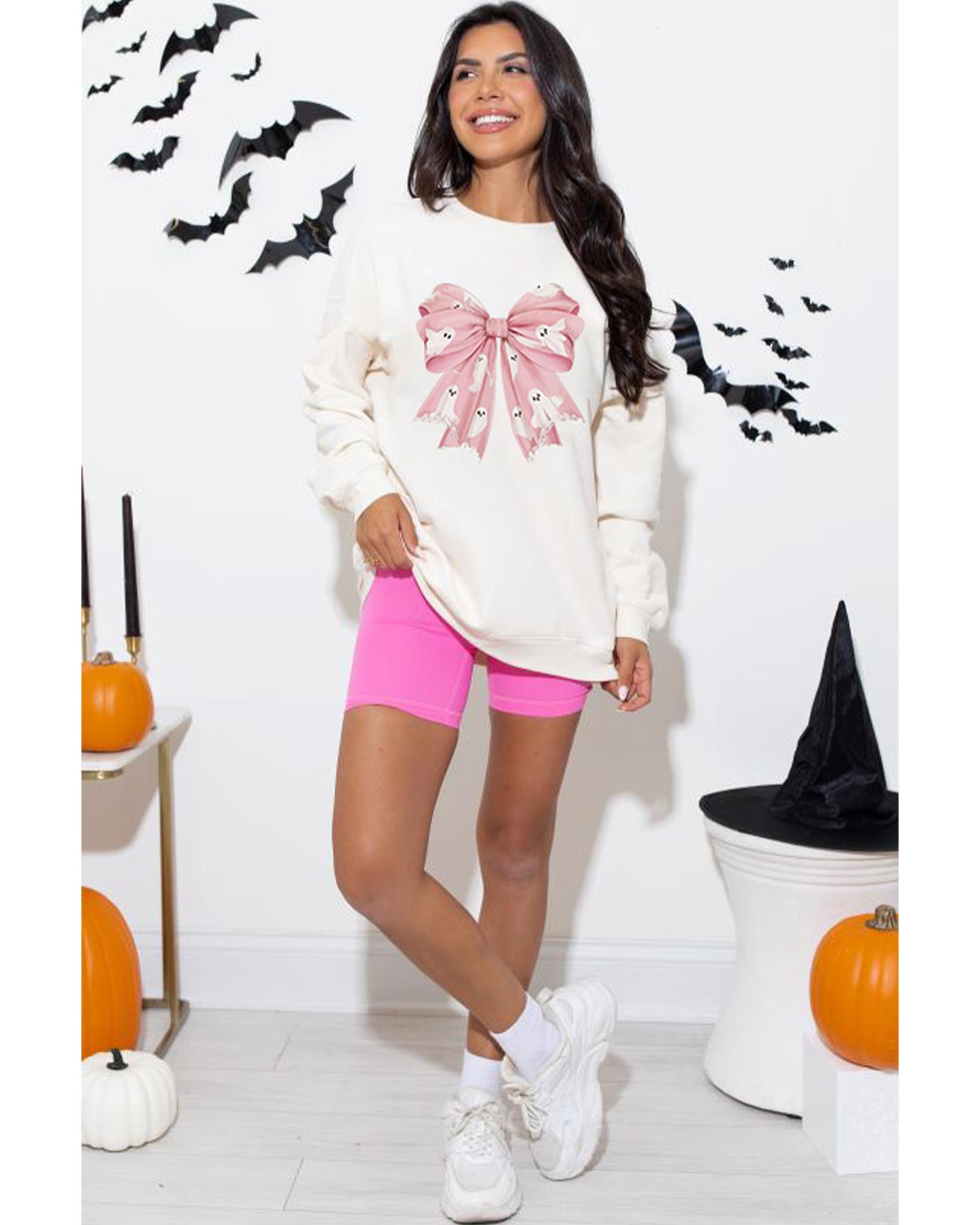 • Beige Ghost Bowknot Graphic Crew Neck Drop Shoulder Sweatshirt