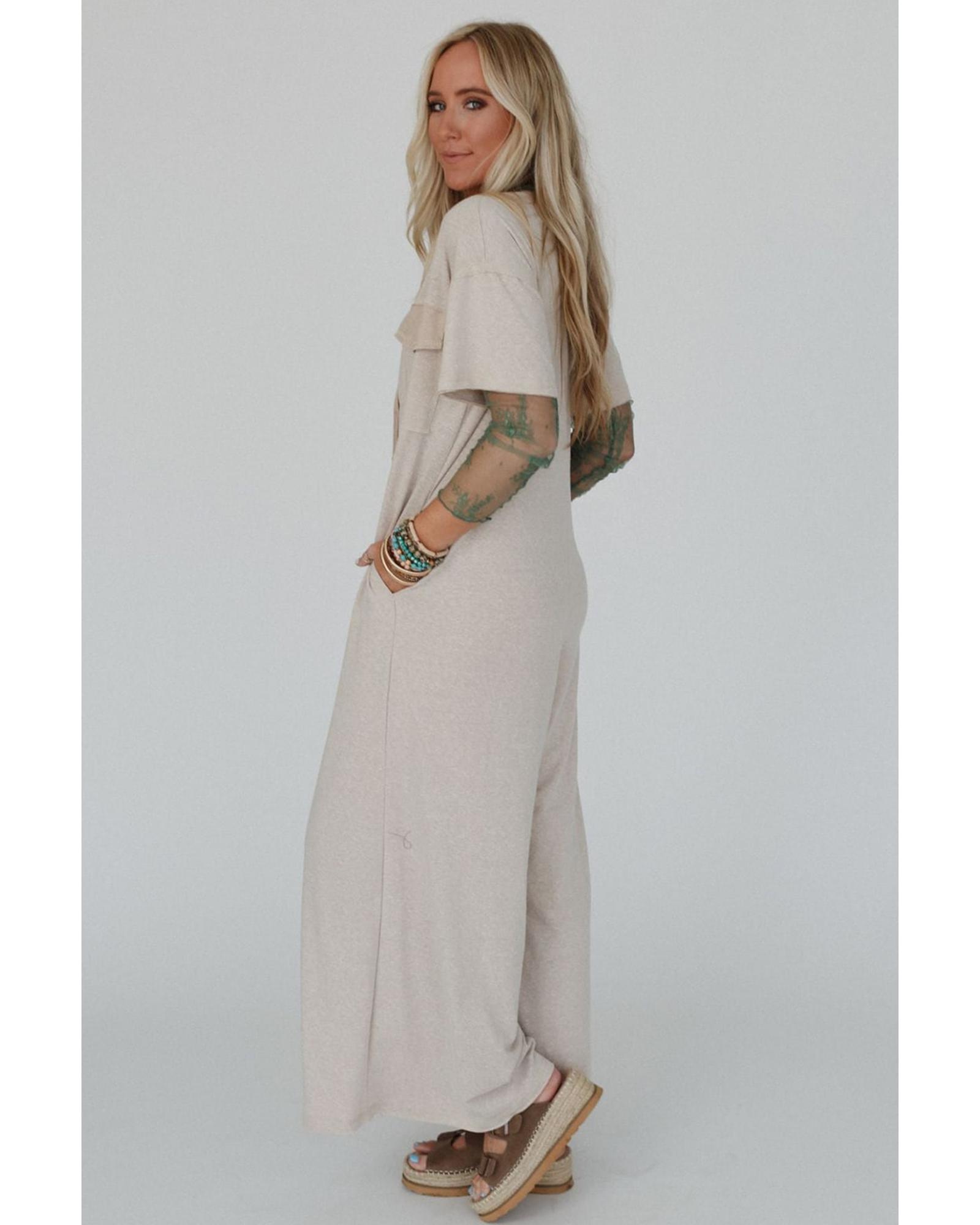 Beige Half Placket Chest Pockets Short Sleeve Wide Leg Jumpsuit – M
