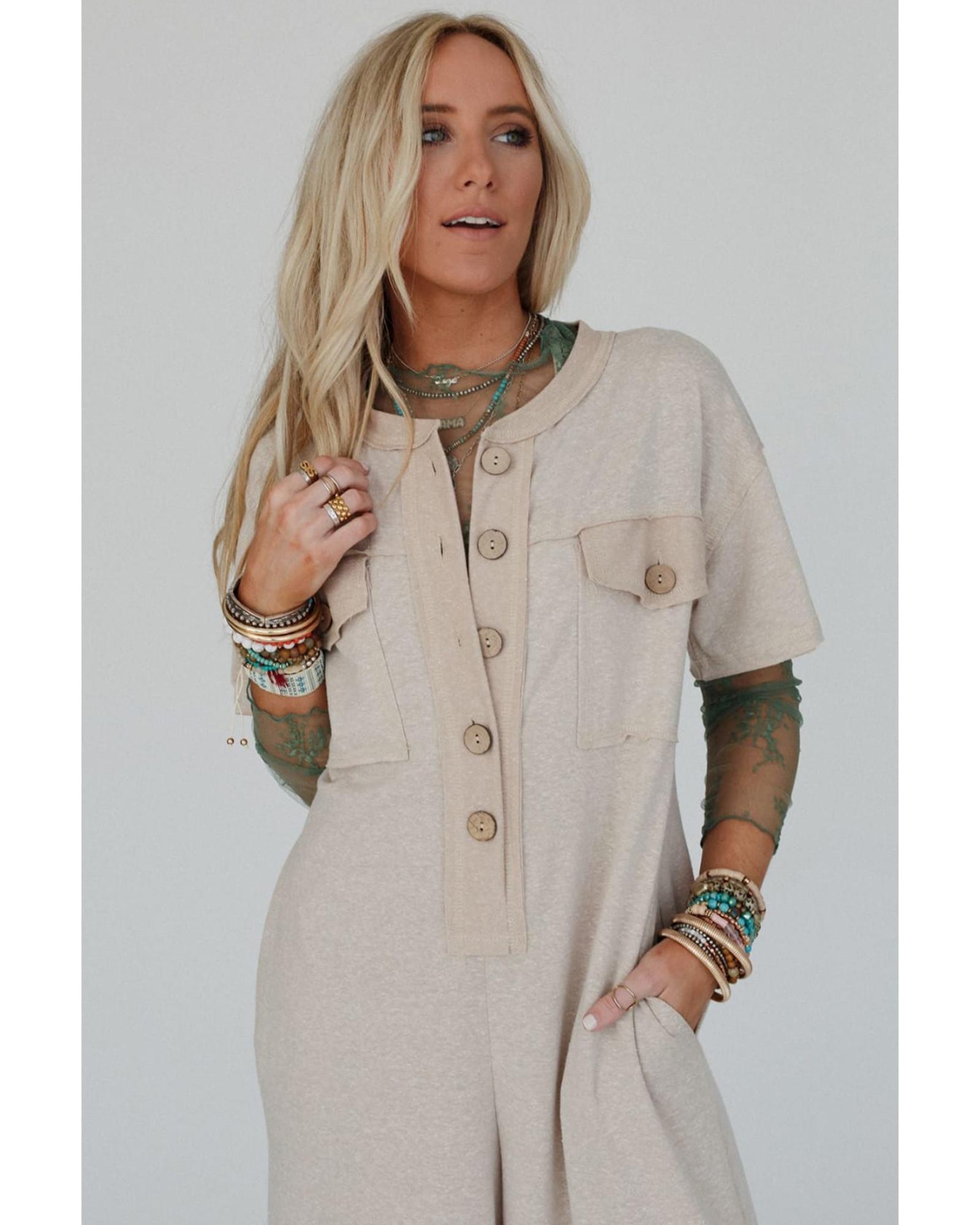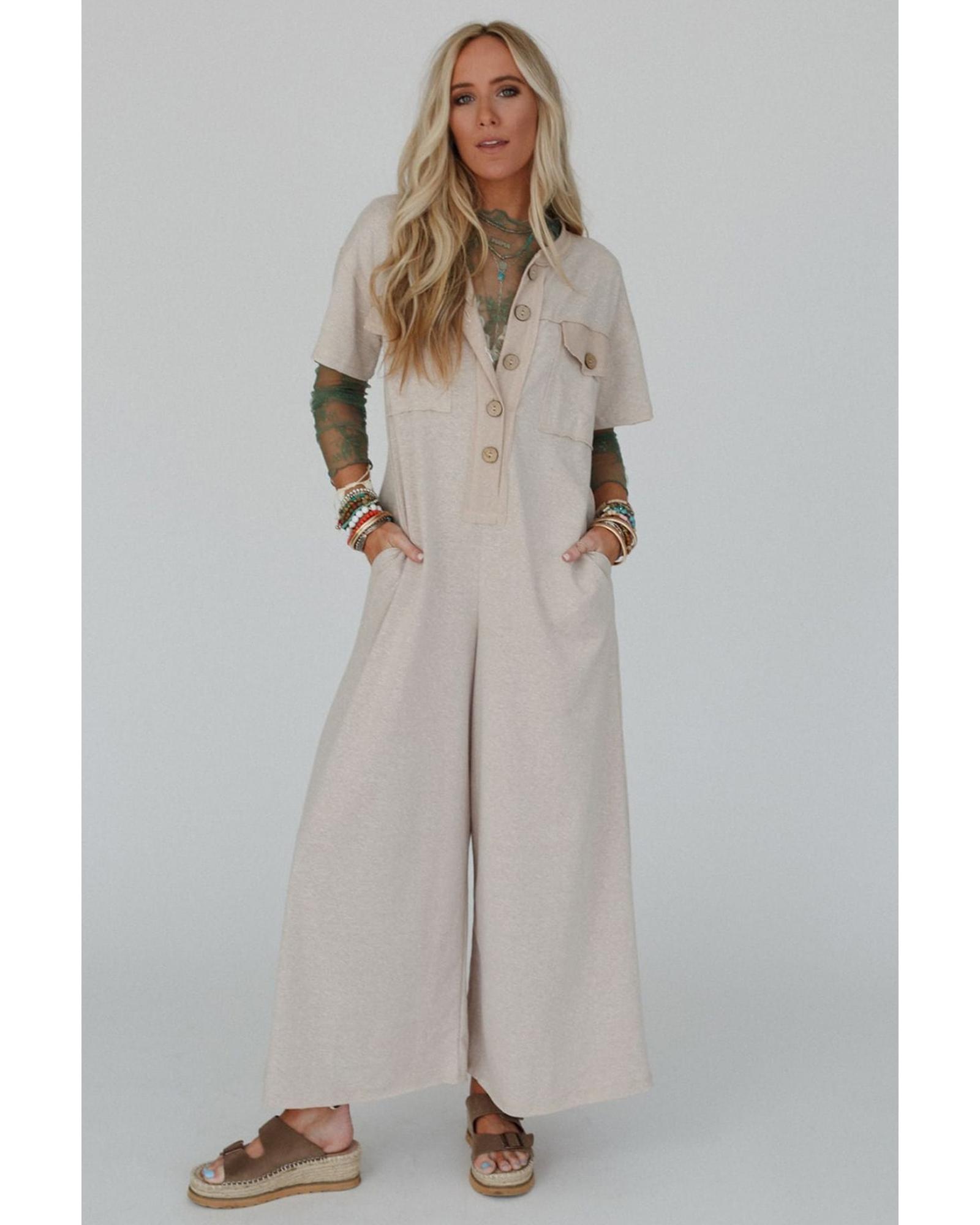 Beige Half Placket Chest Pockets Short Sleeve Wide Leg Jumpsuit - S