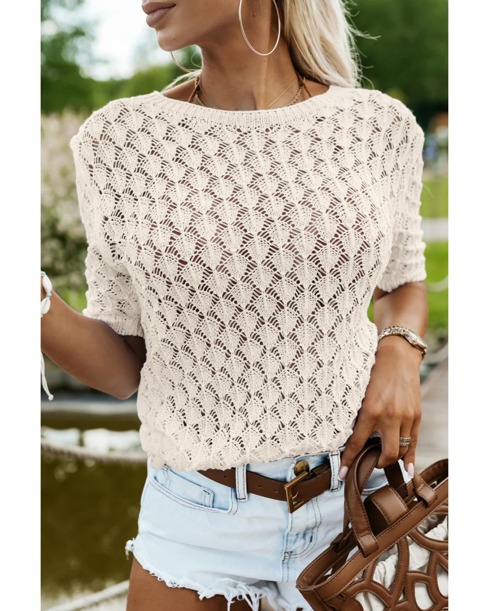 • Beige Hollow Out Crochet O Neck Short Sleeve Sweater Tee