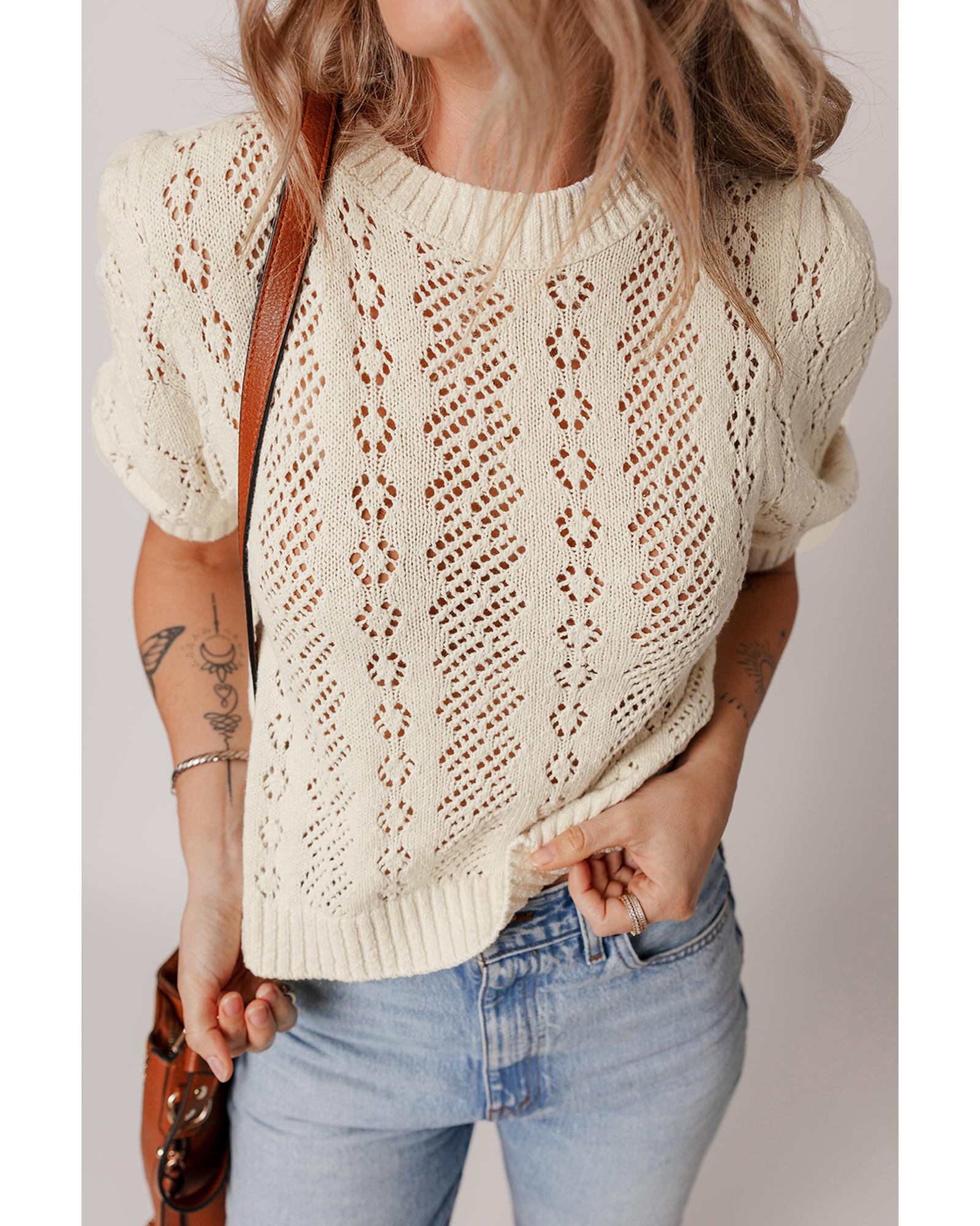 Beige Hollowed Pattern Knit Short Puff Sleeve Sweater – XL