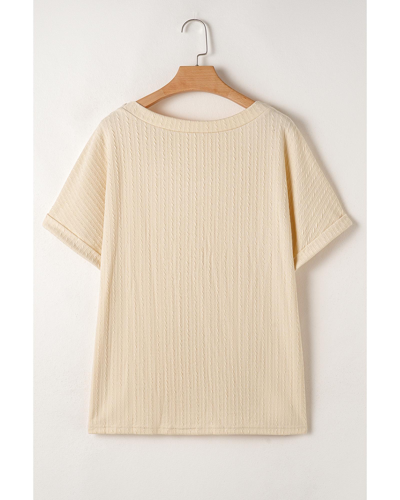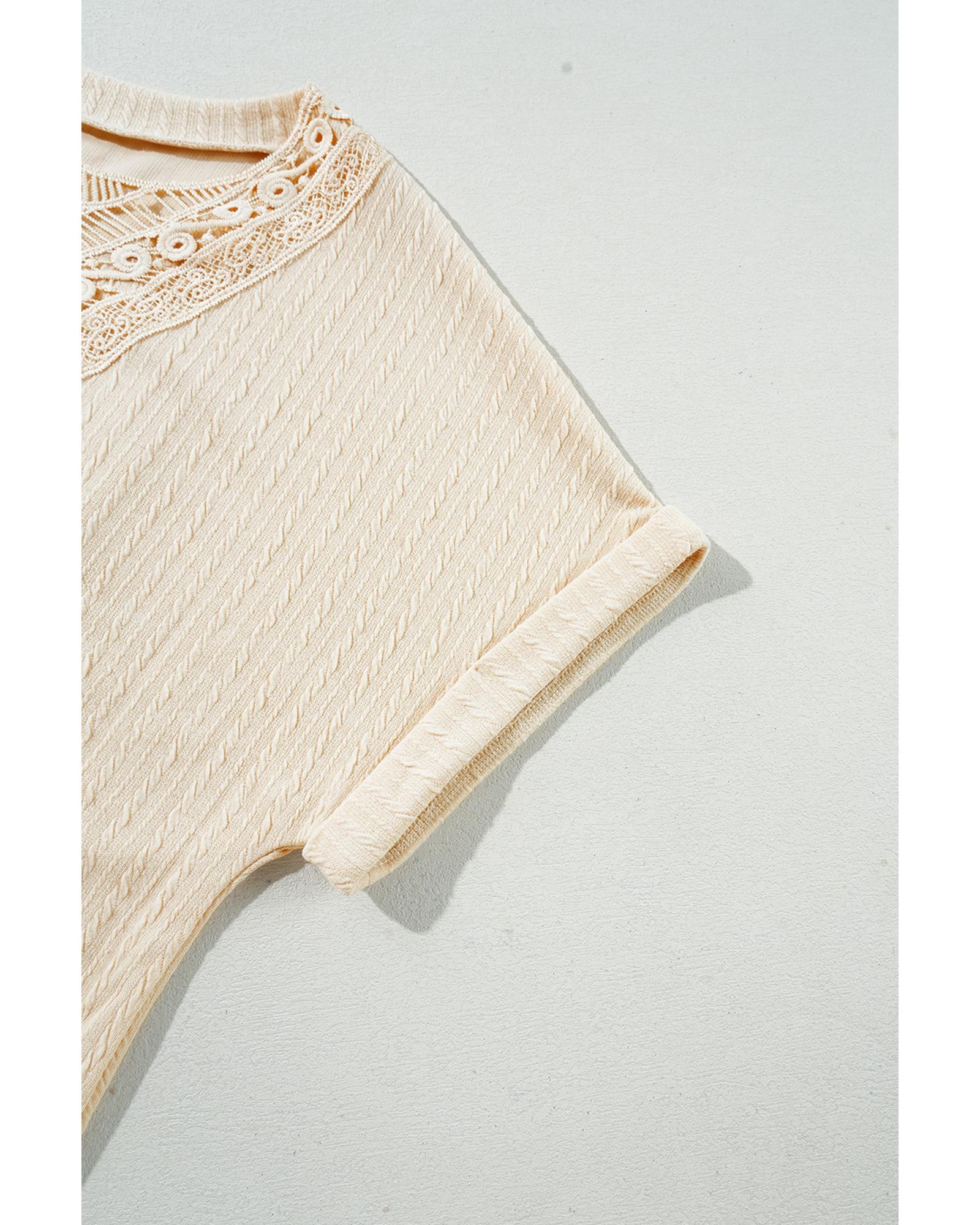 Beige Lace Crochet Patched Cable Textured Cuffed Short Sleeve Plus Size Top – 1X