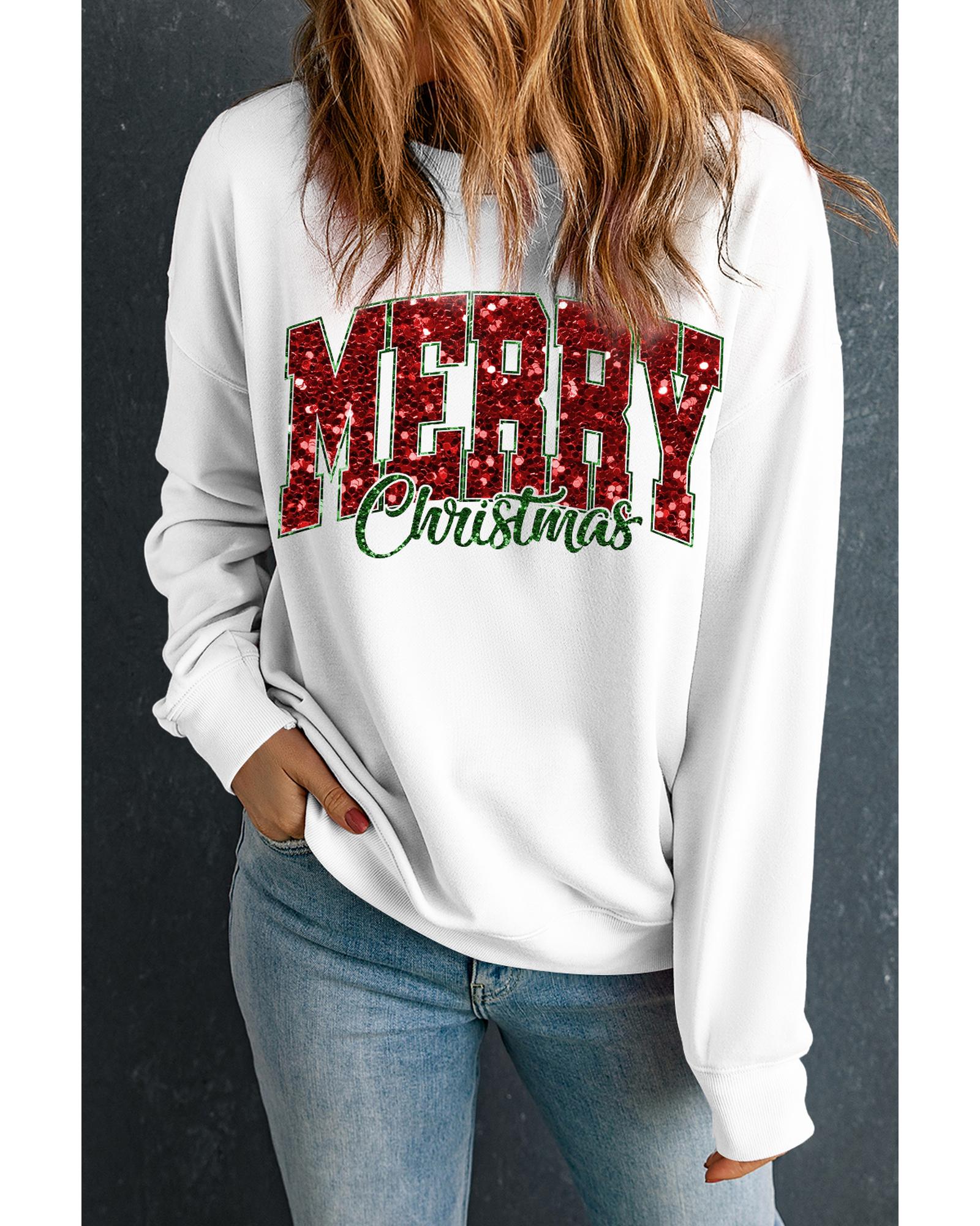 Beige MERRY Christmas Heat Transfer Printing Crewneck Pullover Sweatshirt – S