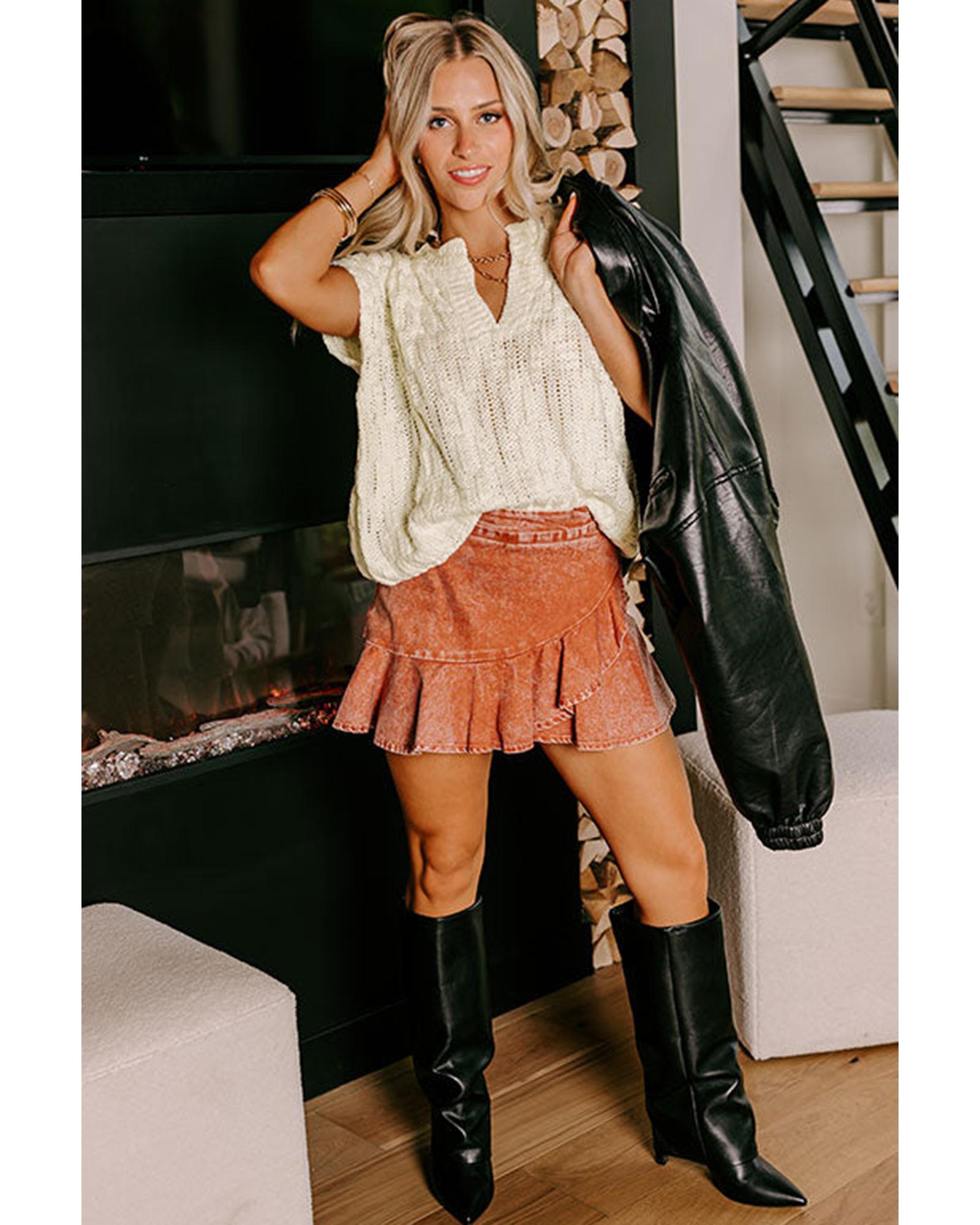 - Beige Notched V Neck Short Sleeve Sweater