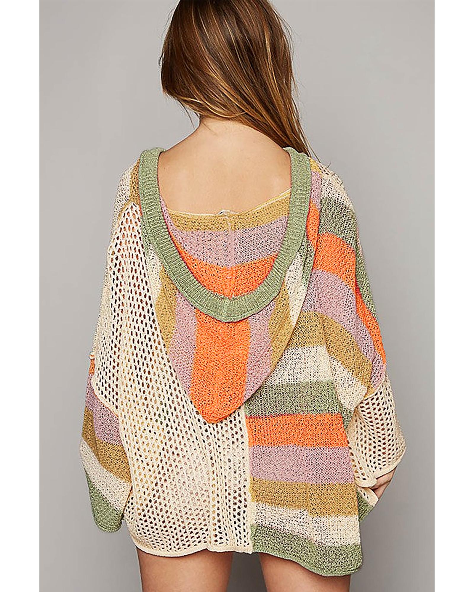 Beige Oversized Colorblock V Neck Hooded Sweater – M