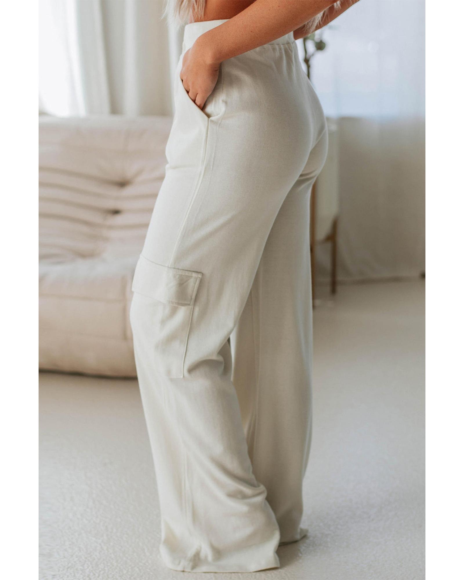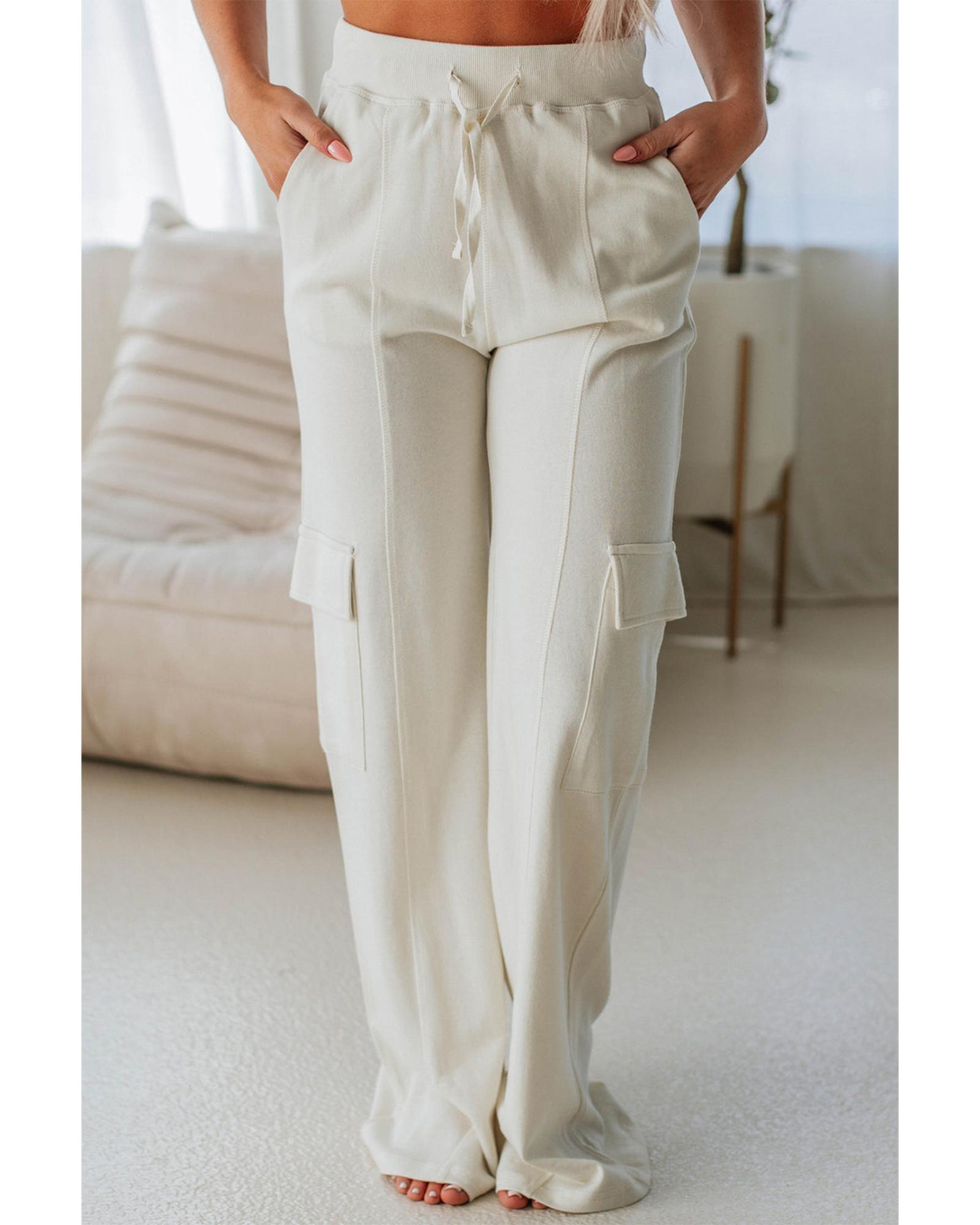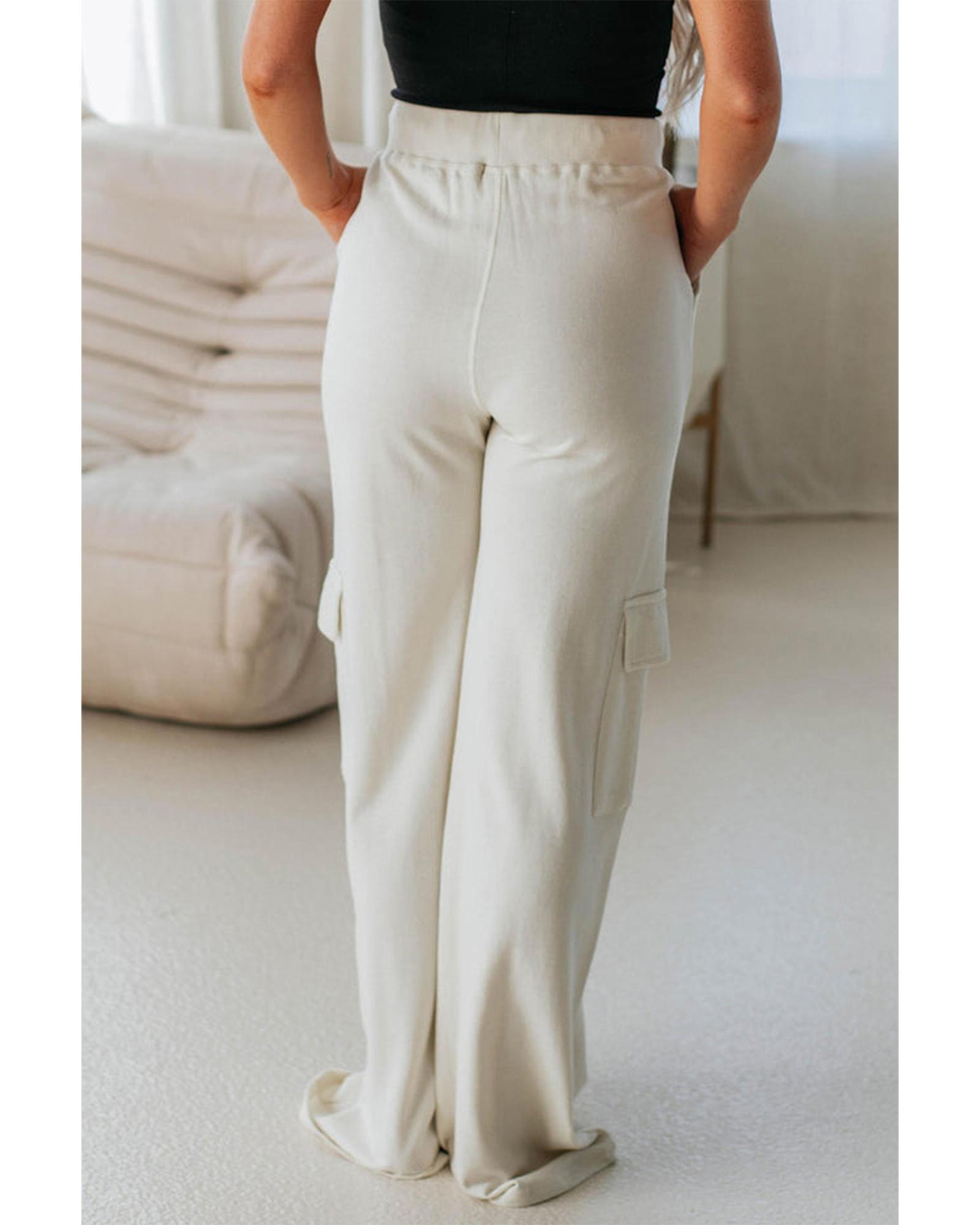 Beige Plain Cargo Pockets High Waist Casual Sweatpants – M