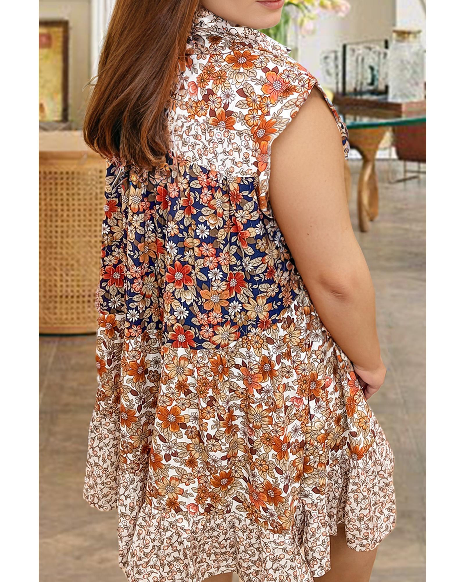 Beige Plus Size Floral Patchwork Button Front Collared Mini Dress – 4X