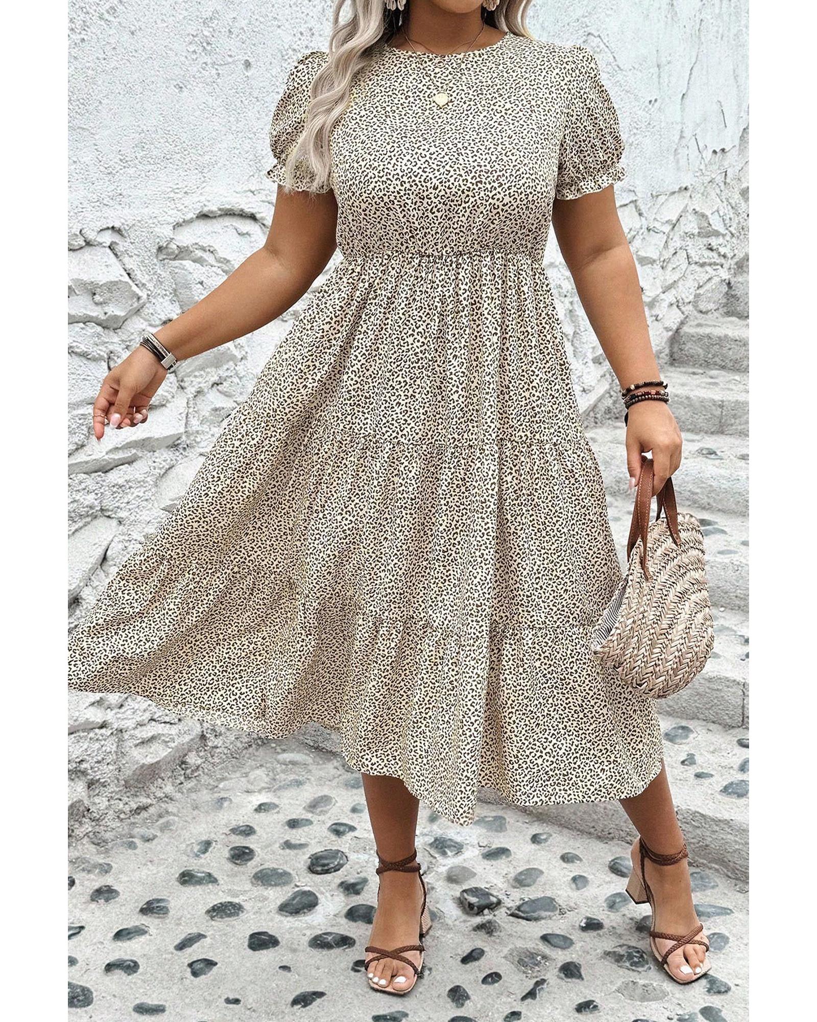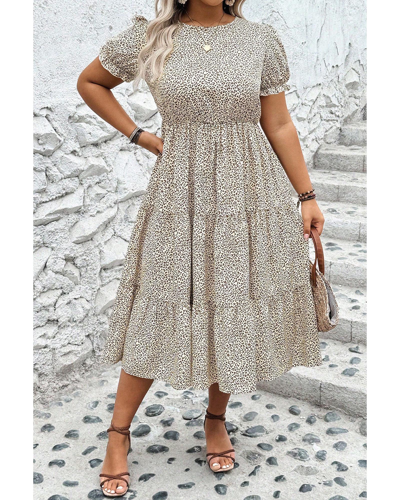 Beige Plus Size Leopard Print Frill Trim Short Sleeve Flared Dress – 1X