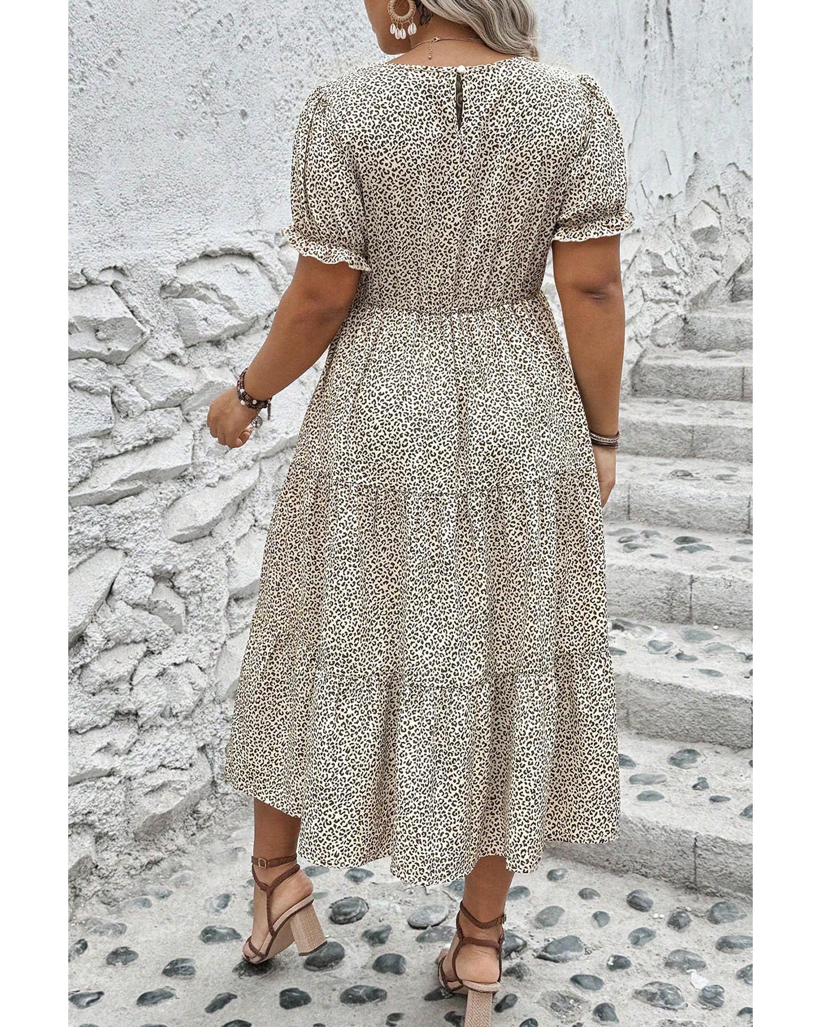 Beige Plus Size Leopard Print Frill Trim Short Sleeve Flared Dress – 3X