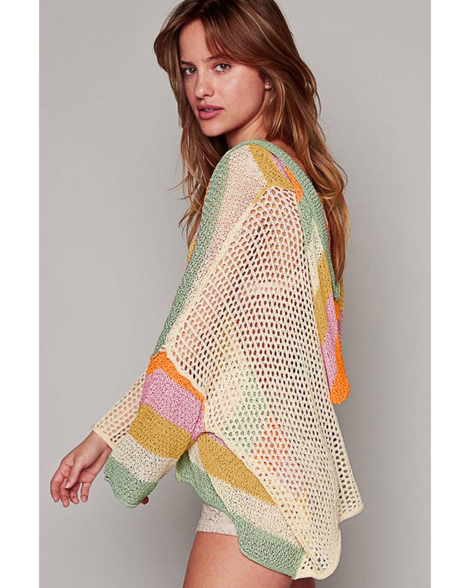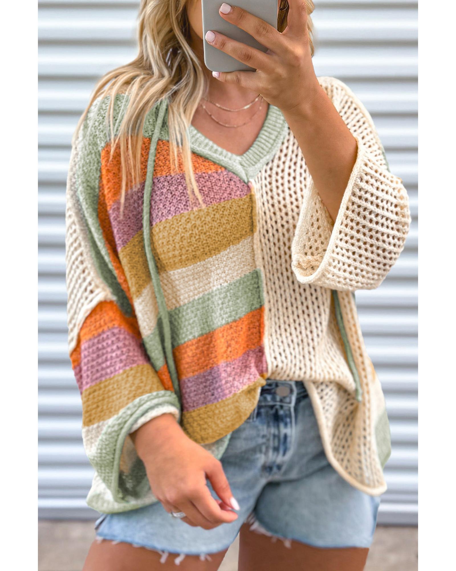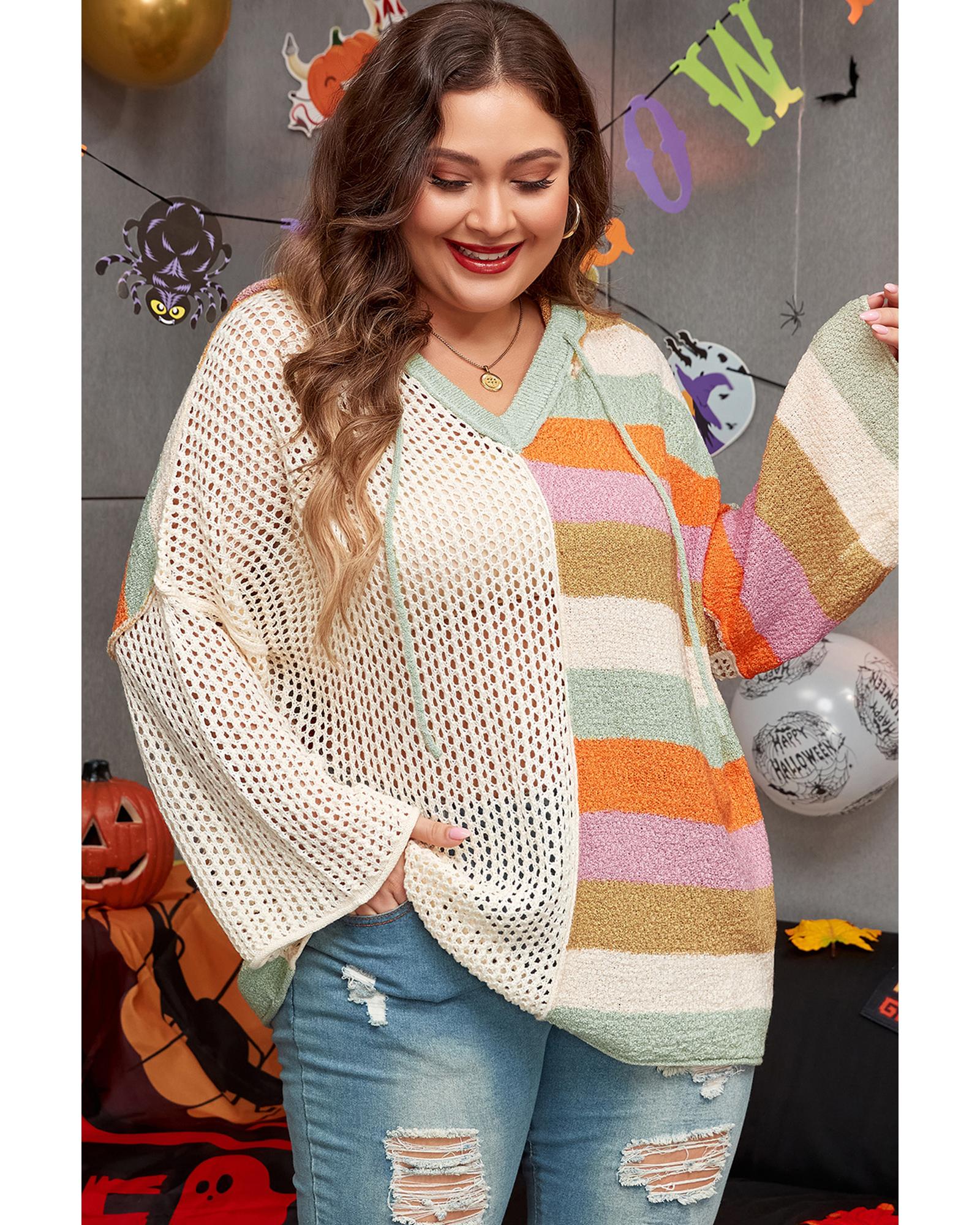 Beige Pointelle Knit Colorblock Patchwork V Neck Hooded Plus Sweater – 2X
