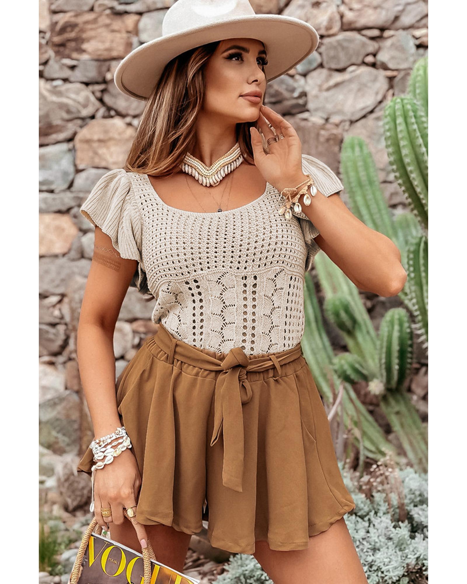 - Versatile and feminine Beige Pointelle Knit Flutter Sleeve Sweater